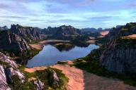 The terrain is from High Resolution Terrains 1 with a self made material. The lake is the ground plane with my water. Sky and ambient light by an HDRI from HDRI for Fun and additional clouds from Object Clouds 2D & 3D, the key light by the sun.