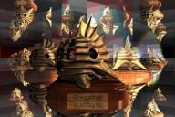 The main object is from Material Showcase 2. It stands with the camera in a 6-sided column from Additional Primitives with a self made reflecting material. Ambient light and colours by an HDRI from Hyper Textures Base and some light by the sun.