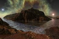 Double stacked self made terrain with a material from High Resolution Terrains 1 & 2 and Landscapes under Fantastic Skies. The water is the ground plane with my material. The two suns are from the Space Construction Kit. Sky and ambient light by an from Deep Space HDRI 2 and a bit of light by the sun. A far away world lit by two suns.
