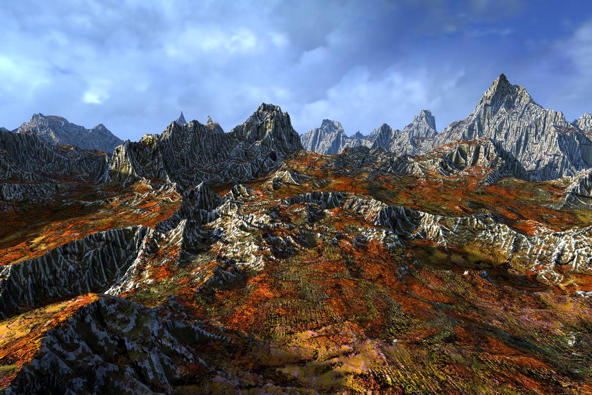 The terrain is from High Resolution Terrains 2 with an adjusted material from the same set and Gritstone Hills. Sky and ambient light by an HDRI from Grand Mountains and the key light is by the sun.