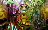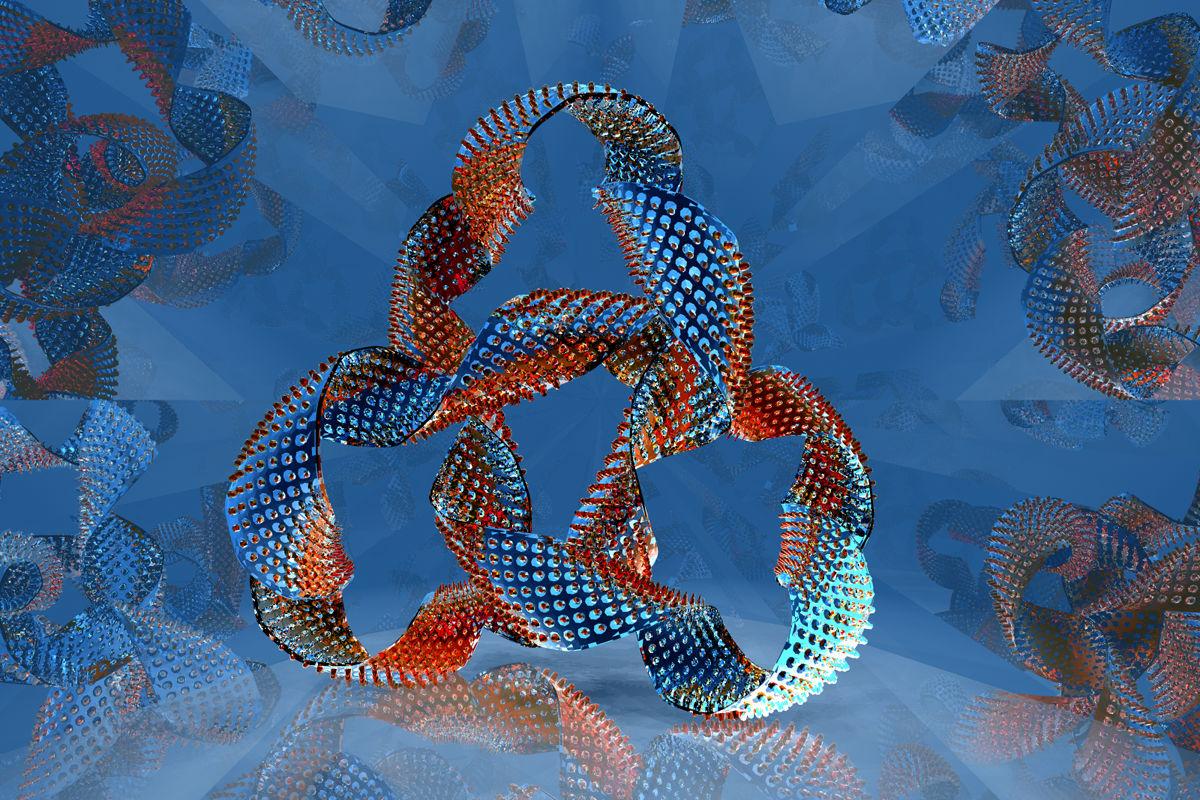 Two in Wings3D created ribbons, one with pimples outside and the other one inside a bit smaller, with materials from Fifty Funky Shapes and Fifty Funky Metals. They stand on a Fading Disk. Everything with the camera within a 8-sided pyramid (comes with Bryce 7.1: Installed Additional Primitives) with transparency and reflection each 50%. Light by the WhiteSphere HDRI, the blue colour by the sky. No sun.