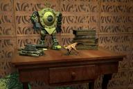 Again, just rendering some imported objects that I have already created. Making this image reminds of how much I've forgotten already. The material on the desk top should have been tweaked. I was too lazy to find a nice wallpaper. But, you know what? I just enjoyed playing with the objects. The books have promise with a chalice and wizard items. The dinosaur is pretty cool. The cannon would look great with my pirate stuff. I did a bit of burn.
