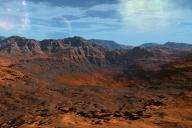 The terrain is from Grand Mountains with a material from High Resolution Terrains 1. The moon is from the Space Construction Kit. Sky and ambient light by an HDRI from Deep Space HDRI 2. The clouds are from Object Clouds 2D & 3D and the key light by the sun. A big subsidence in the landscape of a remote world.