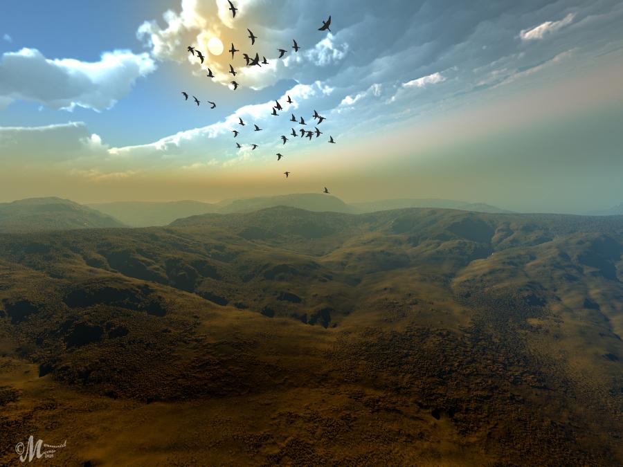 The terrain and material is from Sky Toolbox lit by an Hdri from Hdri Captured Volumetric Skies. The birds are by Marco (C-ram).
