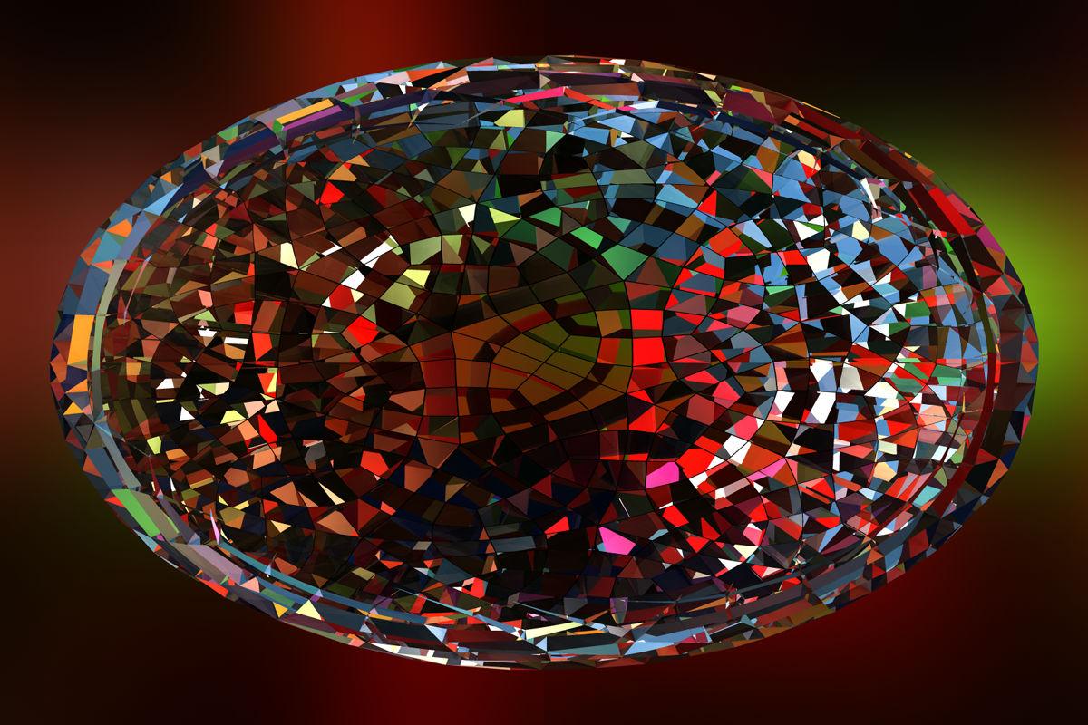 The object was created in Wings 3D by David Brinnen for Bryce 6.0. Within it is a negative sphere to cut out some parts. This sphere was displaced a bit, the aspect ratio of the object changed and the material as well. Light and colour by an HDRI from Hyper Textures Base.