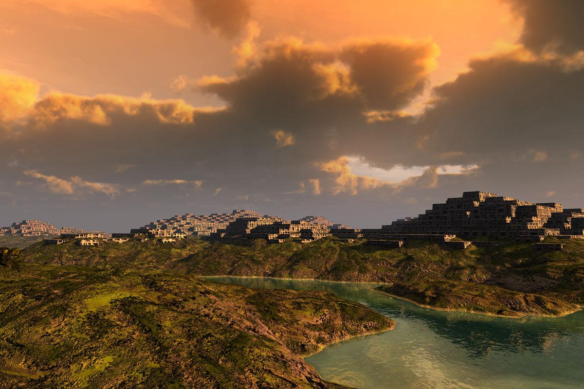 A terrain generated in the TE, copied and posterized in the TE with terrasses and blocks, then both stacked. The material for the hills from High Resolution Terrains 2, for the buildings an adjusted Pro Materials Ale_davidbrinnen. The clouds are from the CloudSphere5 from the Sky Toolbox and the ambient light by the belonging SkySC5 HDRI and the key light by the sun. The water is a 2D-Face with a self made material. Apartment blocks on hills.