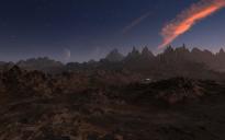 A self made terrain with a material from Landscapes under Fantastic Skies. The building comes with Bryce, within a radial. The moon was self made. The stars are from the Space Construction Kit. Sky and ambient light by the Simplon_SD HDRI from Islands 2 and the faint key light by the sun.