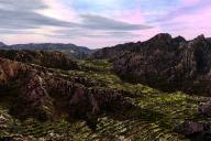 The terrain was self made and given a material from High Resolution Terrains 2. Sky and ambient light by the Gasclouds_B01 HDRI (unpublished) and Cumulus clouds. The key light is by the sun.