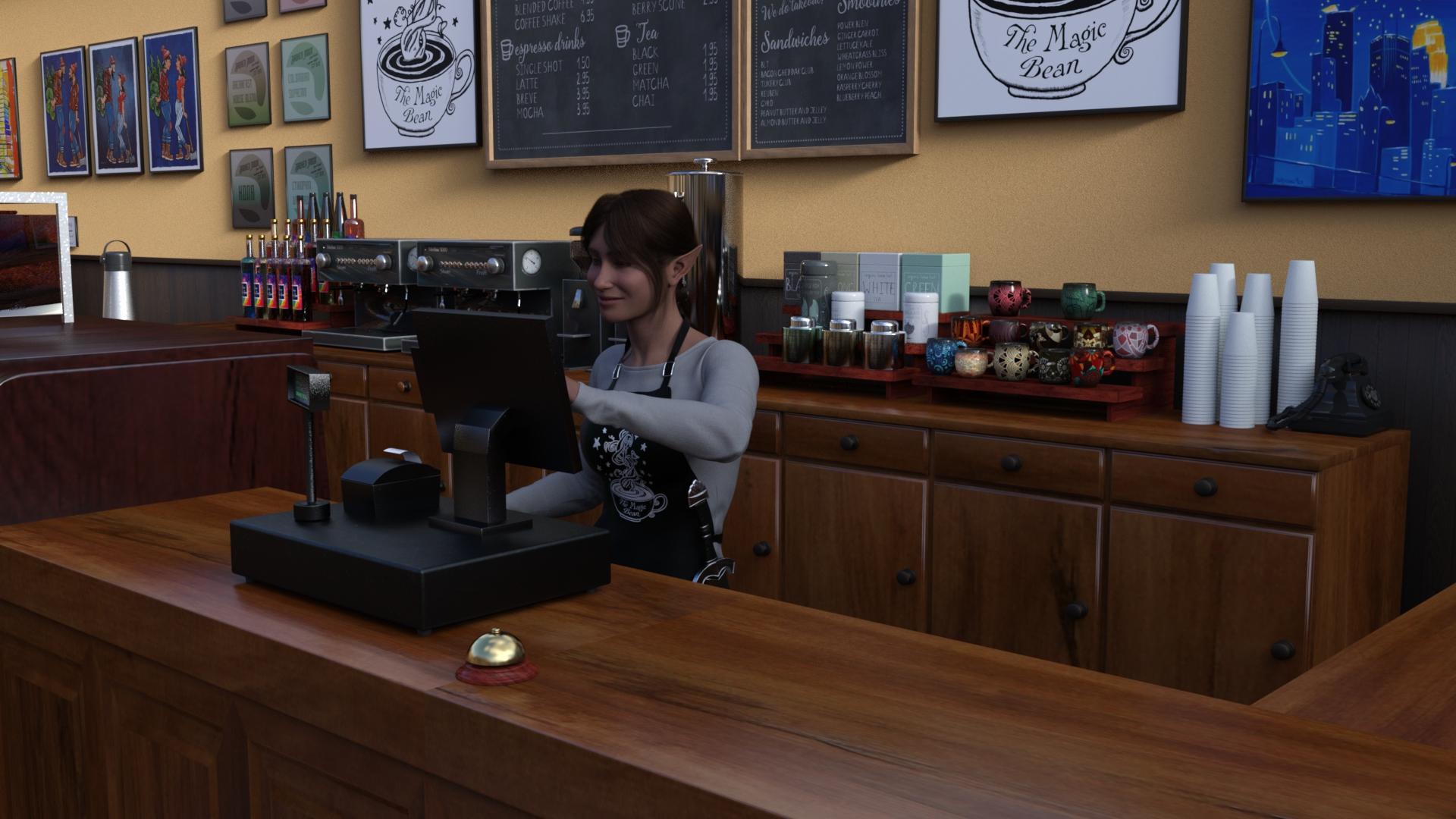 So... obviously I needed to make the coffee shop where she works. It's a converted Victorian in the Uptown of Minneapolis (Minnesota), and the back rooms are a sanctuary for fae-kind. Grace works the front area and is the freehold's defender. And it was my first kitbash project. I basically bought every coffee shop asset I could find, harvested them for parts, and then started filling in the gaps with other stuff. And then discovered that nothing had the right layout and did that by hand with one of the Collective 3D packs and zero idea what I was doing, so I had to go back and re-do a bunch of parts multiple times.