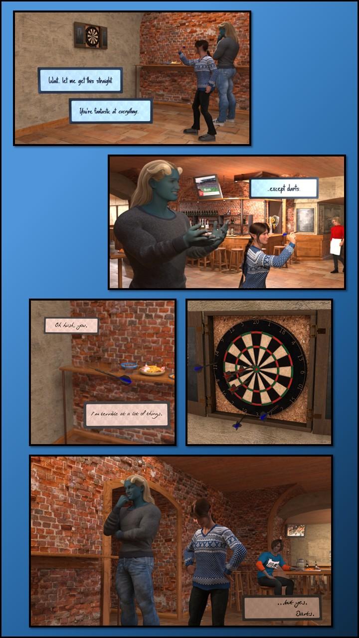 This one started with the first render, and then I was like, "oh hey, there are four of these that go together, actually" and progressed to "oh neat, I could use this for a one-page comic for that thread!" followed by "gosh what do I fill that empty space with"... and then I realized that it wasn't actually an external point of view so much as the mentor's vision, and this is what happened.
