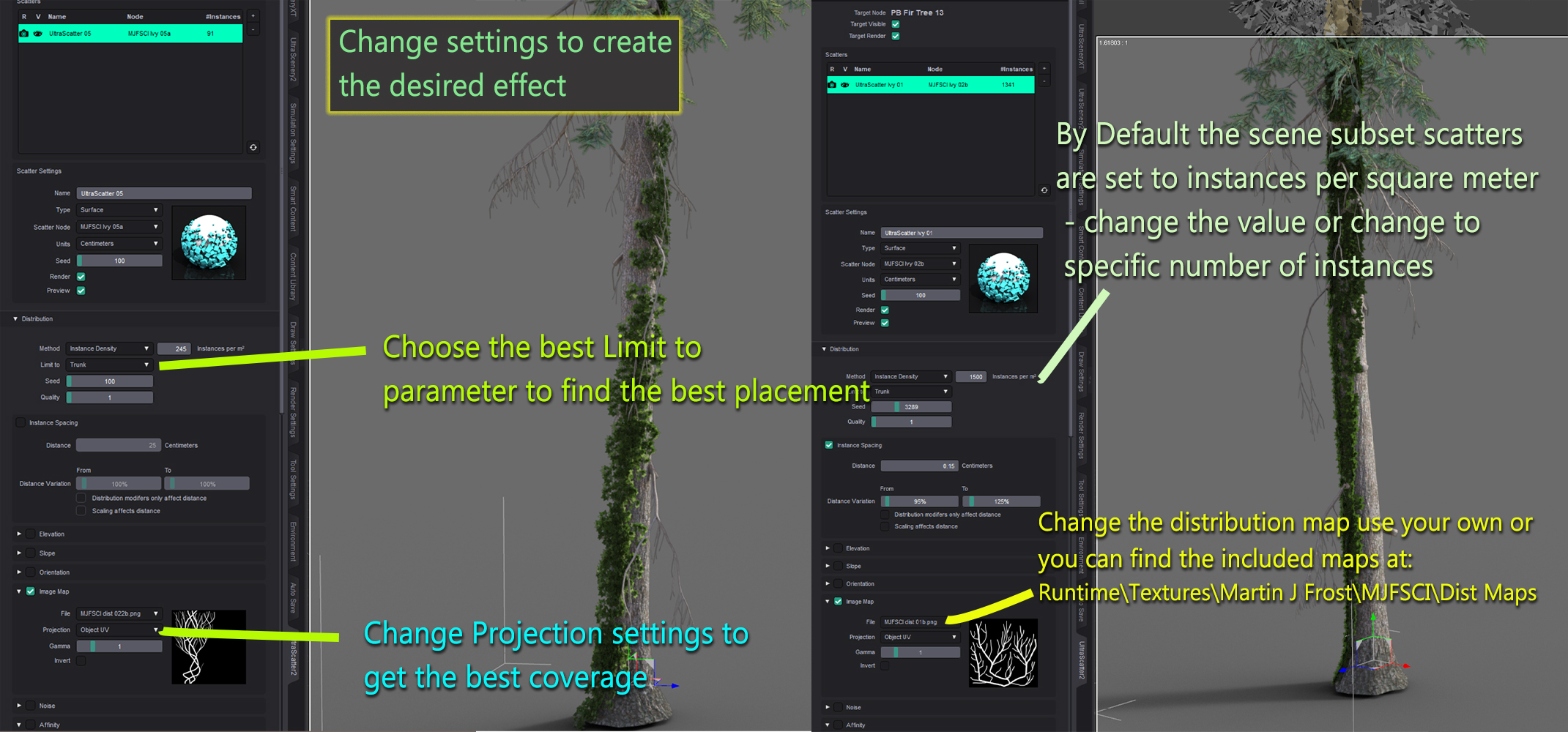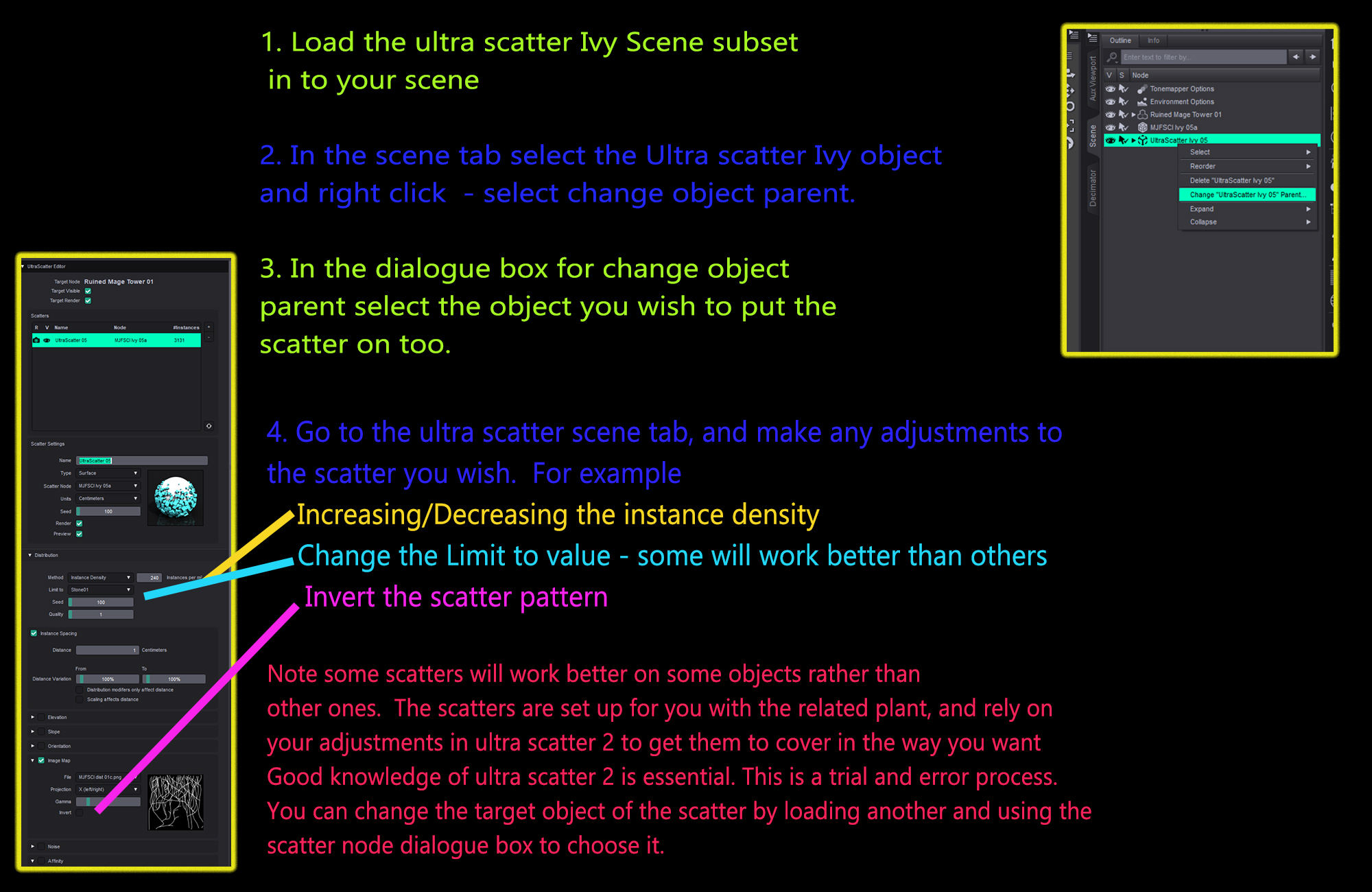 THe included scene subsets are applied to an object by parenting the ultrascatter 2 instance sets they contain to the object you wish to scatter them on ( dont parent the actual plants containnded in the subset). Once this is done they should show up in the ultrascatter 2 window for that object and can be adjusted according to your desires.