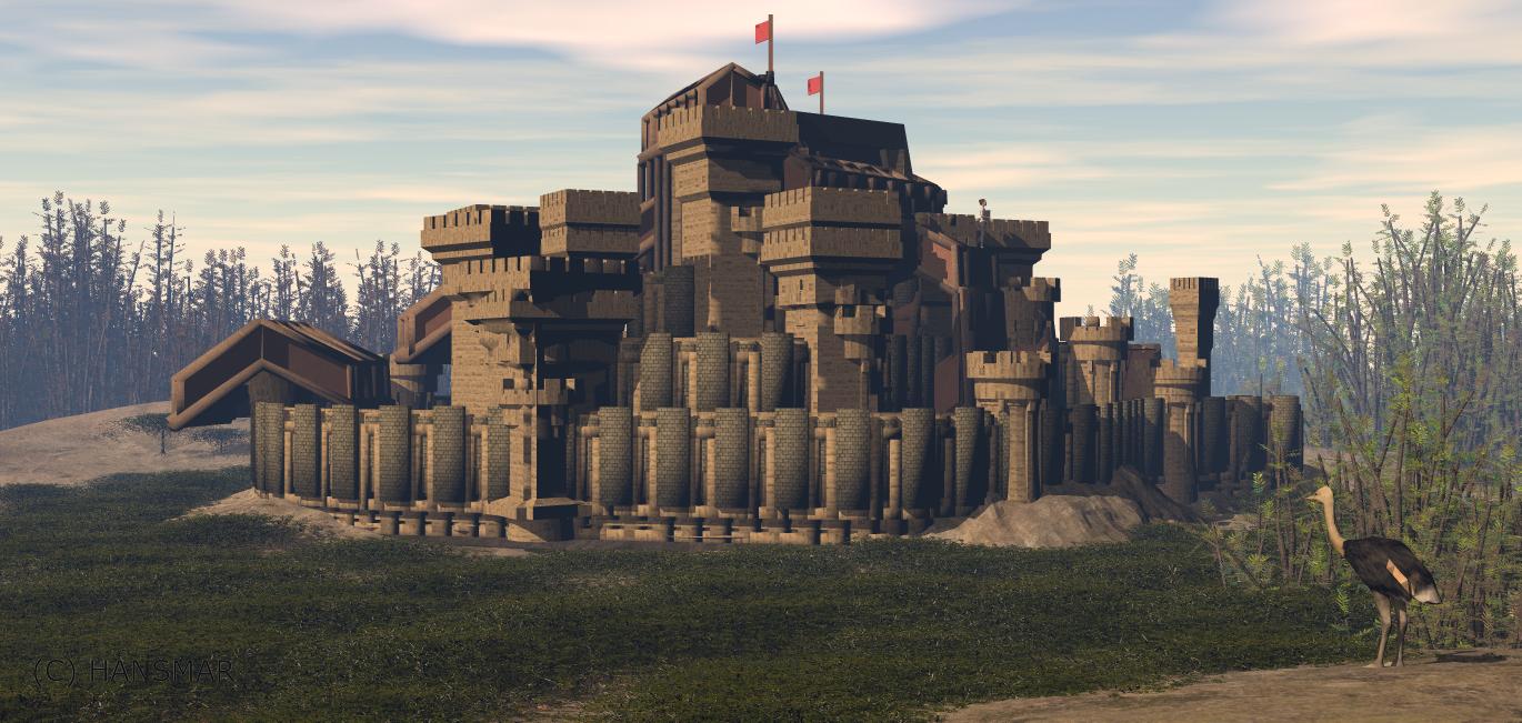 I used the castle freebie in two renders. In one I added a ship (Black Pearl from Renderosity) and a distant terrain. The sky is from fantastic skies. In the second one I added a low poly figure and a low poly ostrich, a couple of ecotrees from the Vegetation set and one low bush from the same set instanced many times. Sky is from Judy K.