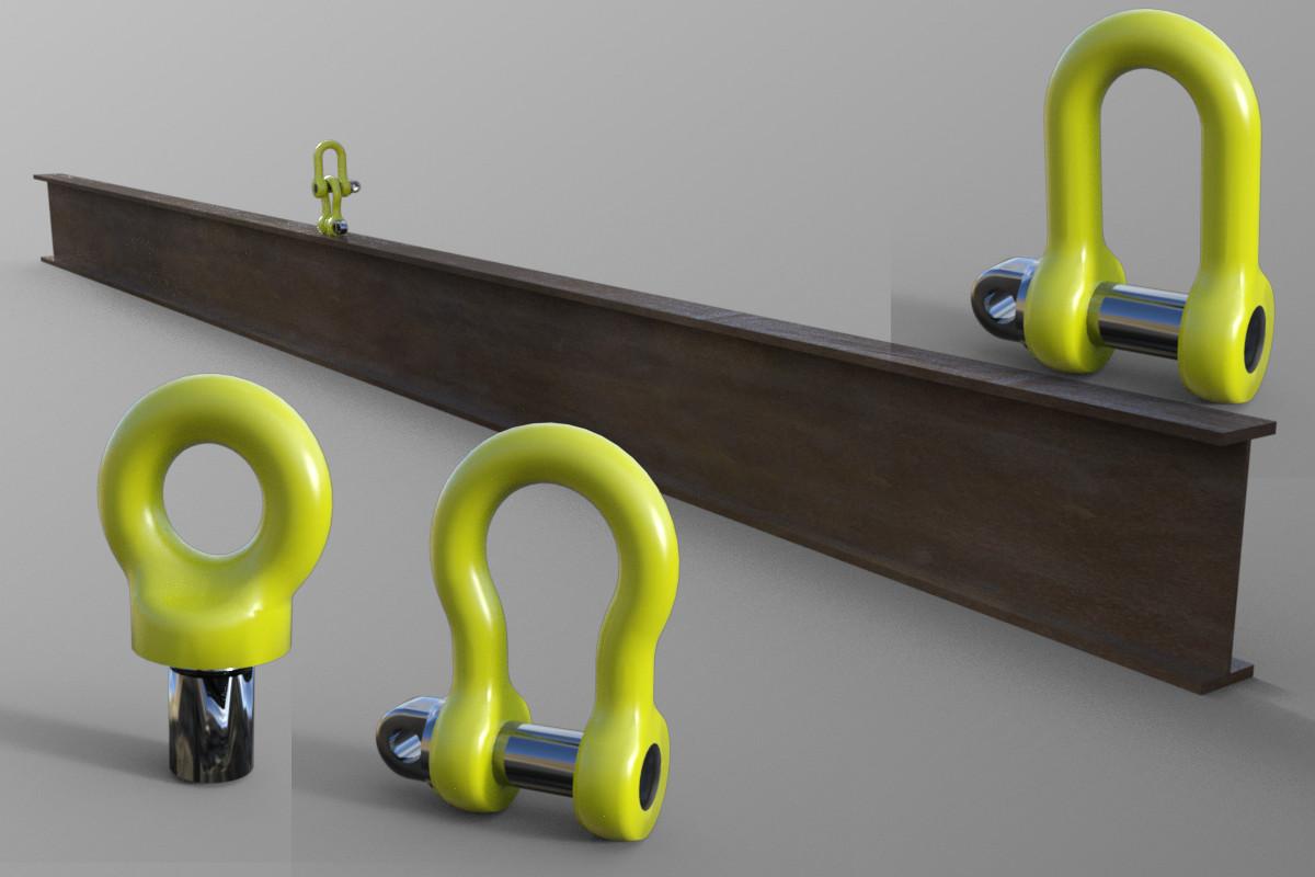The collar eyebolt doesn't have the thread modelled, so just hide the thread if you don't like it. The lifting equipment bits are all correct to their standards. The steel beam has a lengthen/shorten morph, where +1.00 represents an extra metre on the length up to 10 metres, and -1.00 is a shortening of 1m to a minimum of 1metre.