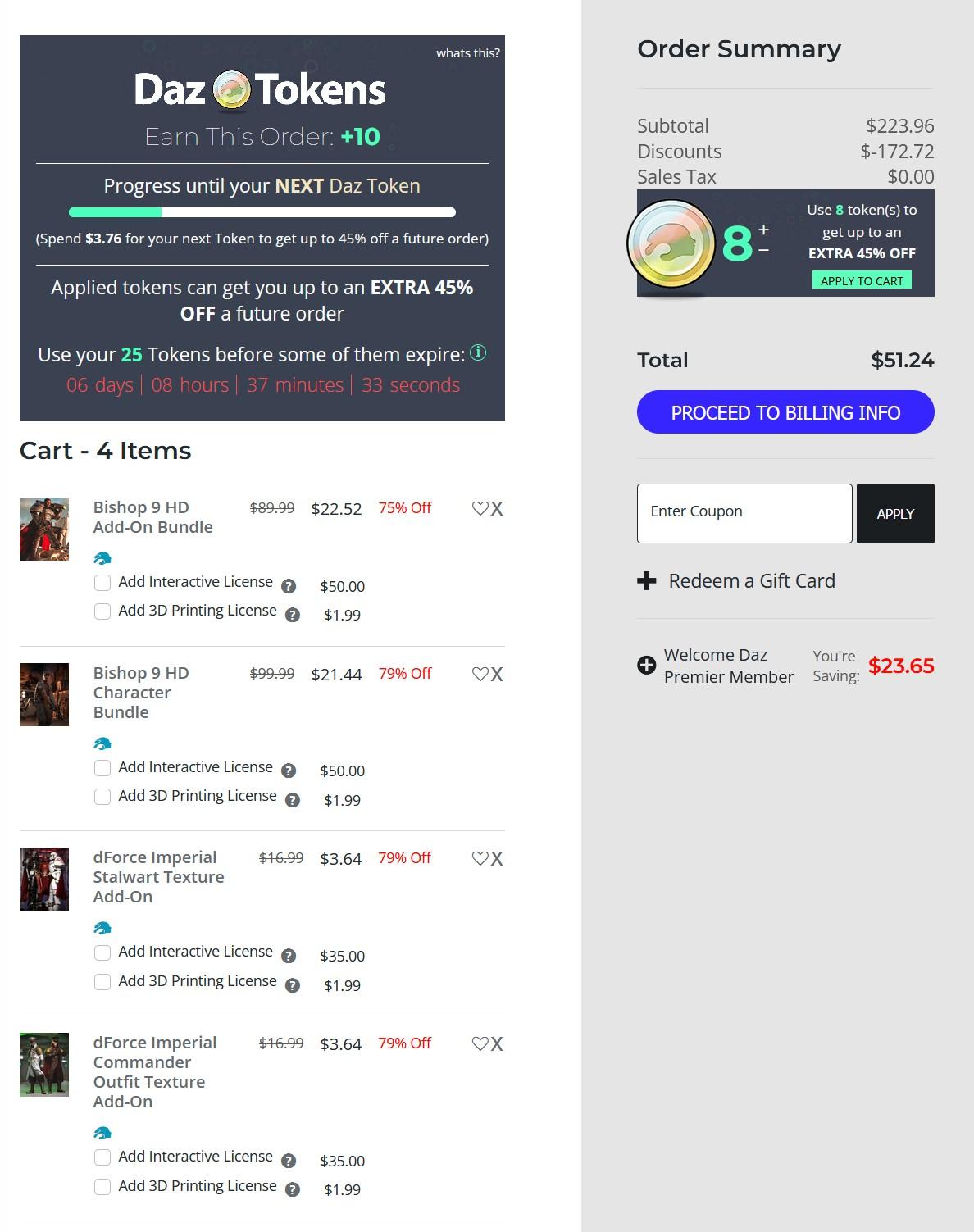 Not sure if there is only one path to the Ultimate Cart but here is what I did. Initially I had everything in my cart, total was $51.24. I removed everything and purchased Bishop 9 for $2.99 under the Golden Ticket (as DAZ Premier Member) - don't know if that changed the overall price if I had not bought him as a Golden Ticket item first, but wanted to try the alchemy on the cart.  Then I went back and put both Bishop 9 Bundles and two texture add-ons in my cart (yes, it warned me that I already owned an item and applied the discount).  Total was $44.67.  I think I can do better!  This is where all those memberships pay off!  I applied my "08_25PREMIER" coupon and got the cart down to $34.68.  I applied 8 Tokens and got the final PULL-THE-TRIGGER!!! price to $14.58.