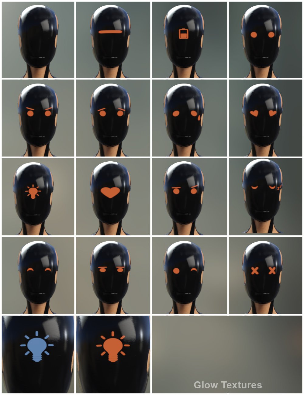This faceless android features a smooth, face-plate surface that displays glowing emotion icons in pink or blue, with 16 distinct expressions to choose from.