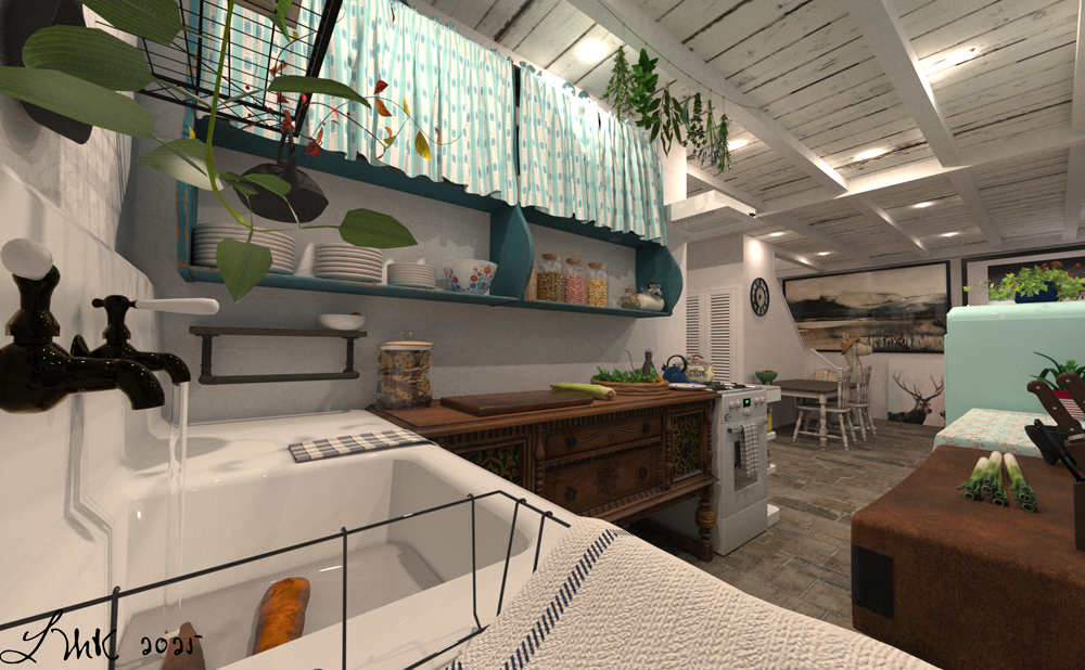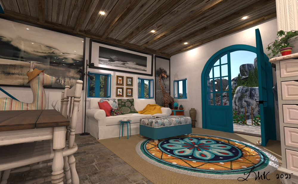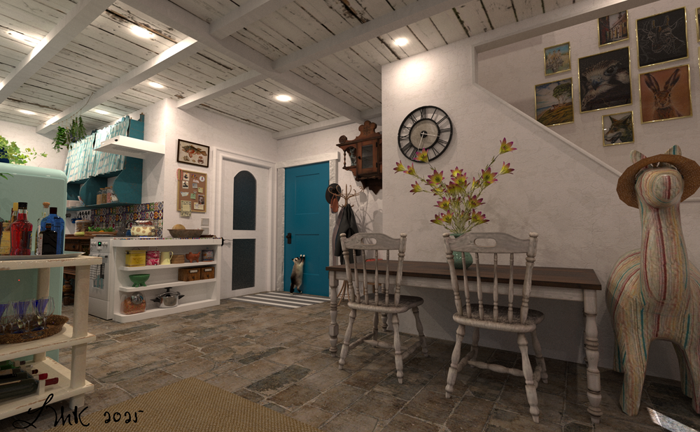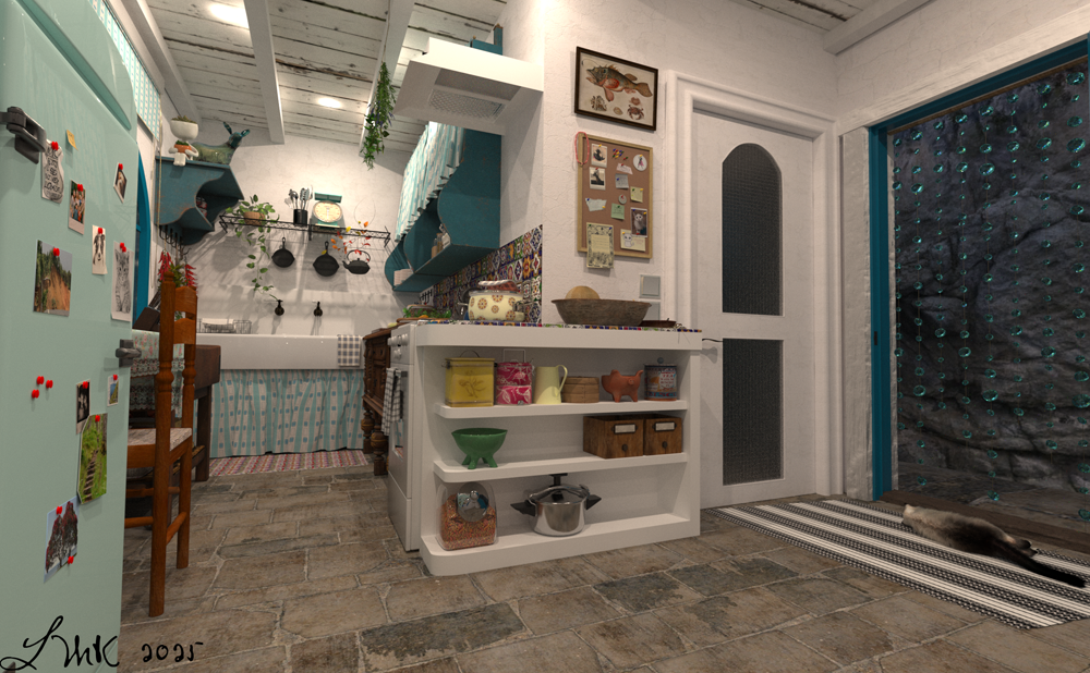 A different angle and yet more change. I had to replace the tree at the front as, though it wasn't lo poly, it was badly made and unsuitable to render up close. So it got downgraded to being a small beach bush and shoved along to the left. I replaced it with one of Martin Frost's low res olive trees from his Mediterranean Trees and Shrubs - Low Res Plants. All the trees, shrubs and other plants will be low res as my 3060 can only hold so much. No subd, no large textures, all optimised to hell and back.
