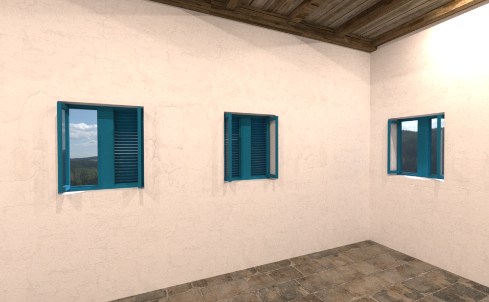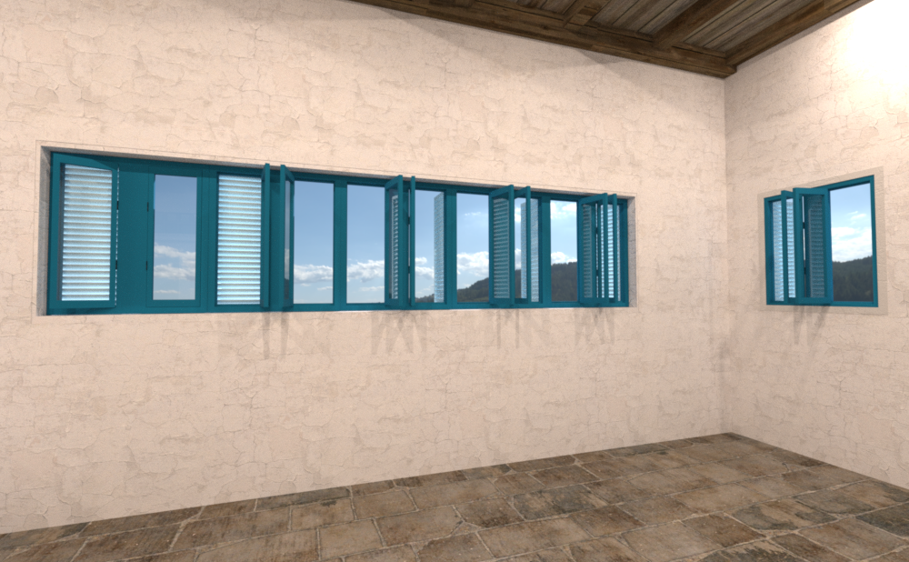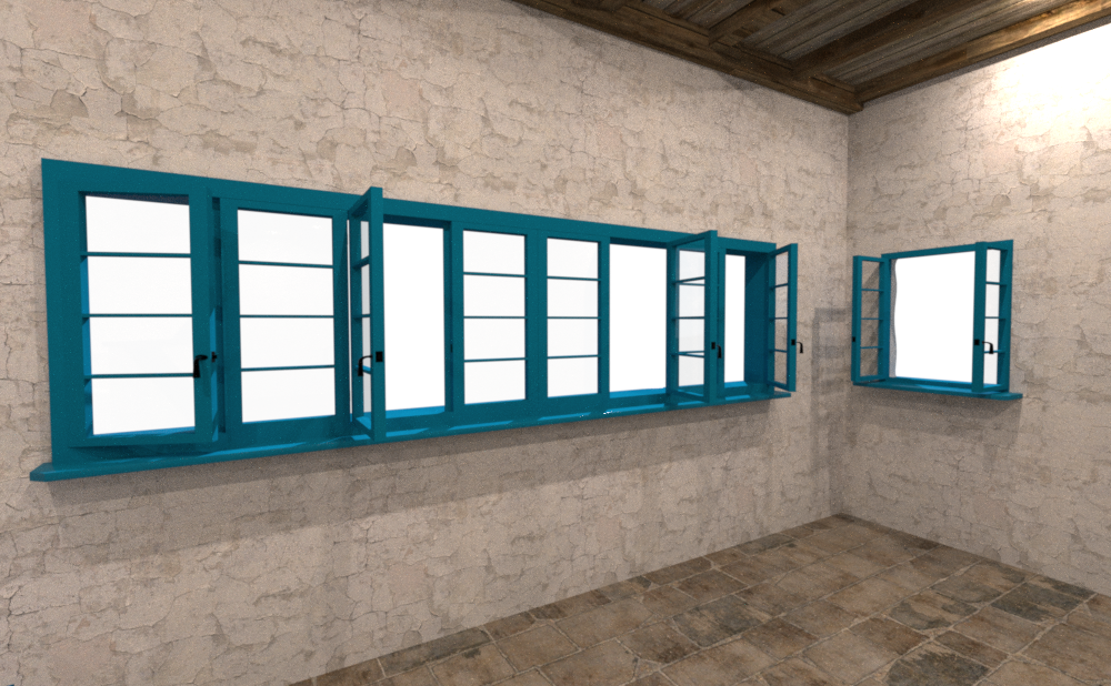 Reasoning: First, The large window looked wrong...not a Greek look to an older house. Then I wanted shutters as well. Then I looked at some photos of Greek houses and they had single windows in small spaces so I copied the front window and put two round the side and filled in the gaps. And I didn't like the windows opening into the middle so I tweaked them to open to the side.
