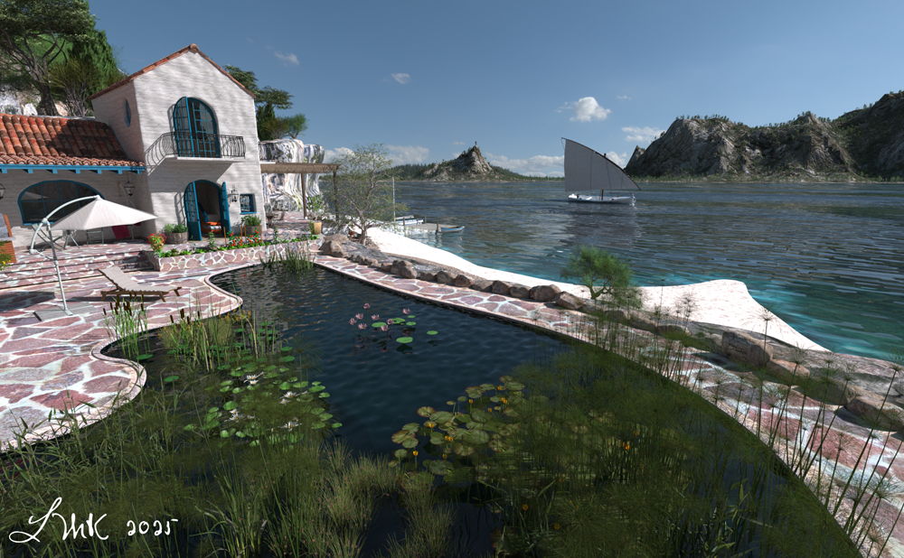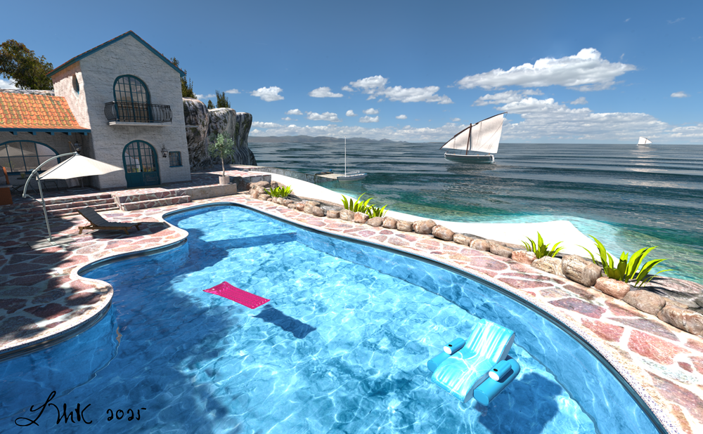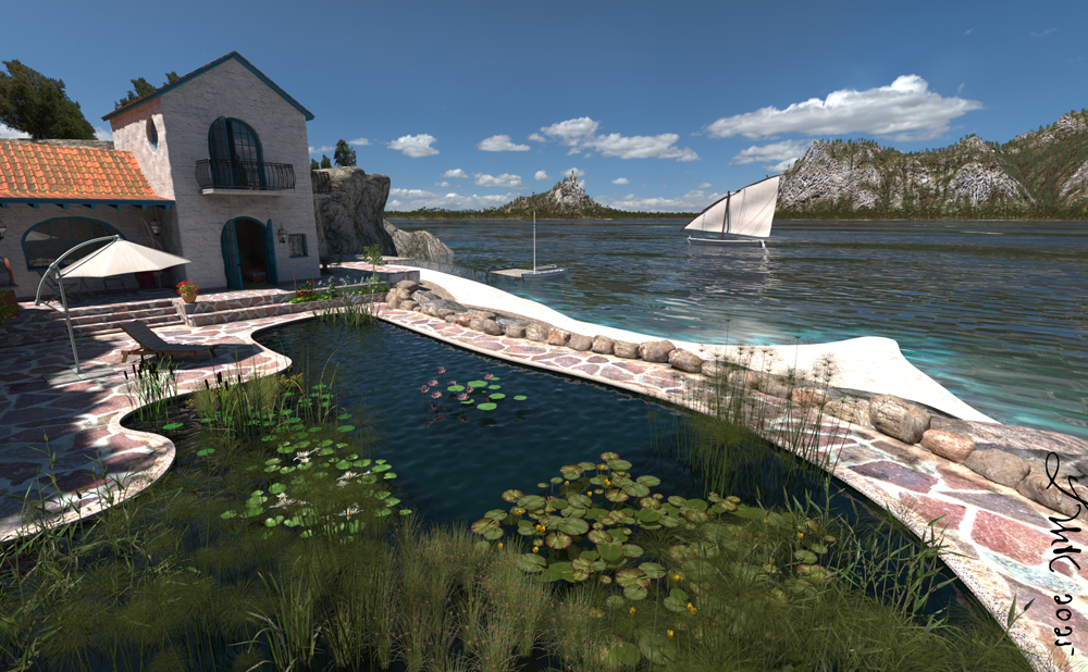 Agreed. The latest iteration is really good. The background islands, the shape of the sea & the trees all add depth of authenticity to the image. The change to the pool is interesting much more so than a swimming pool (unless occupied by swimmers - but that's more difficult to get right). The evolution of the terrace & movement of the house are subtle & I'd have missed it if you'd not mentioned it. Looks better for the changes, though. Good stuff.
