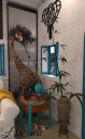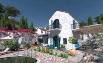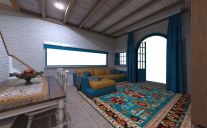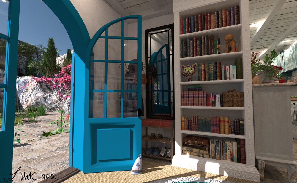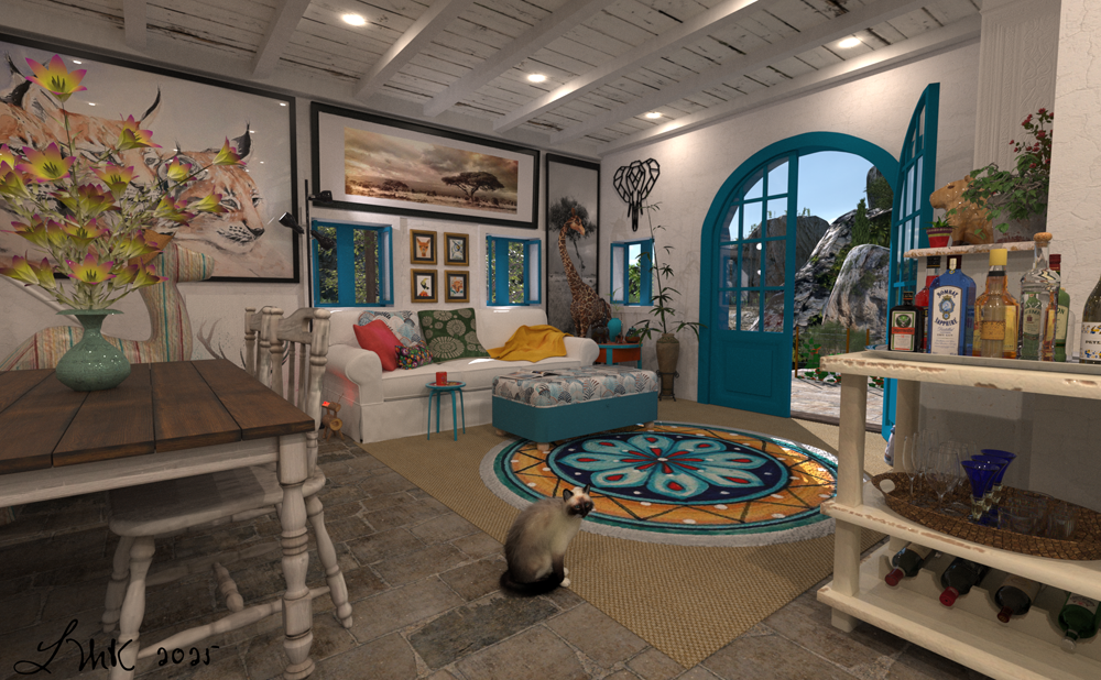 Early on I changed the ivy leaves on the back cliff face to bougainvillia, now a common vine all over Greece. Much more vibrant than ivy. Along that face are a couple of grape vines and a lemon tree. The chairs on the front terrace are another prop from Lindsay's Hill Side Villa.
