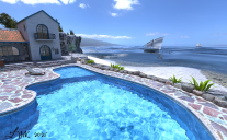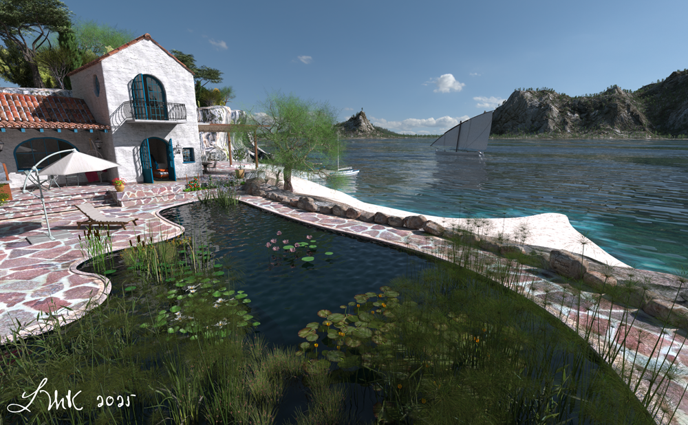 Much change...no more boring swimming pool but now a natural swimming pond, and an island off shore (from Andrey Pestryakov's Mountain Lakes and Forests). The furnishings have begun to take shape. Used Mesh Grabber to extend the terrace, and moved the house seaward. Made a little vege garden between the steps and rocks.