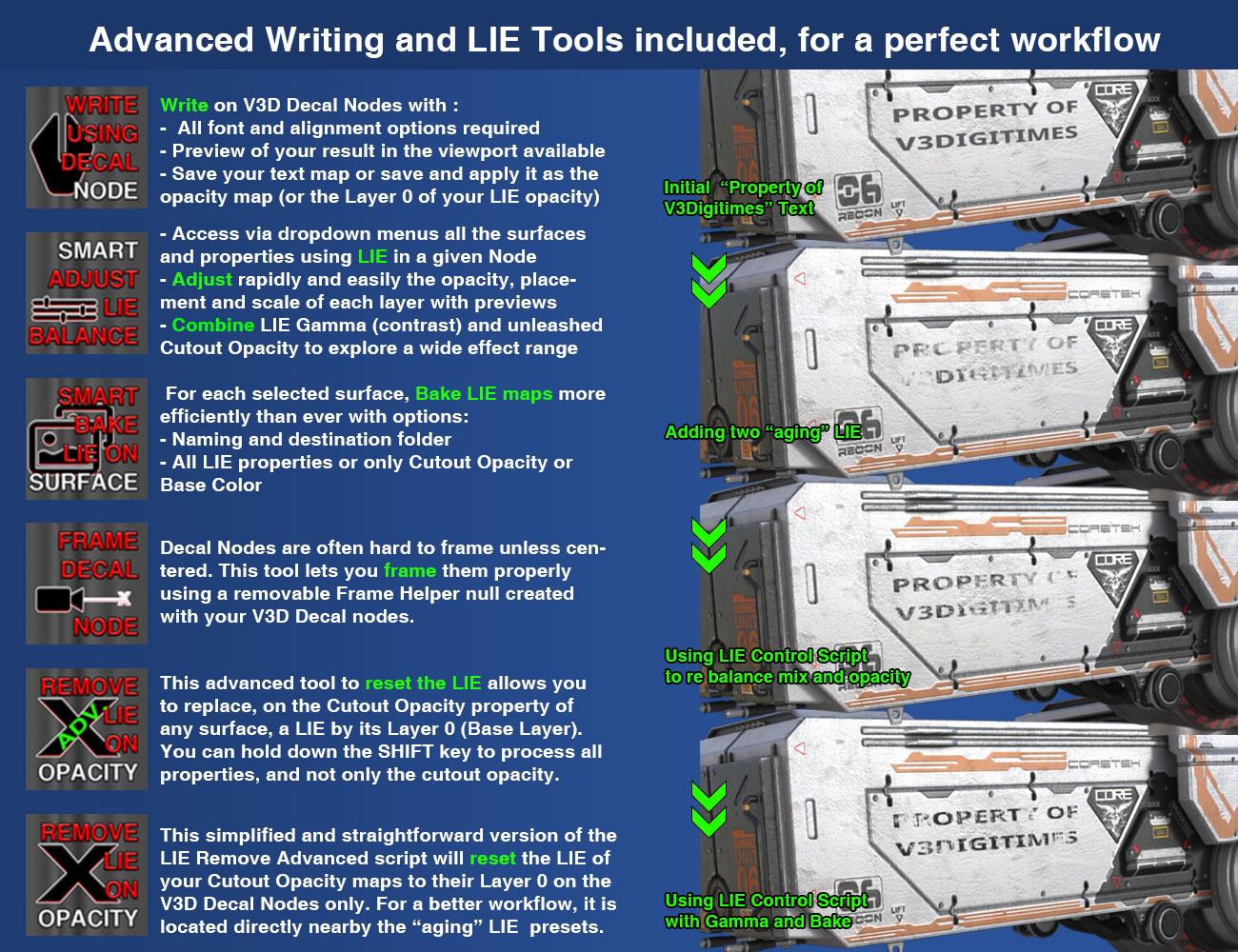 - Two LIE cleaners included: a global cleaner (cutout, base color, or all channels) and a fast cleaner dedicated to decal nodes.