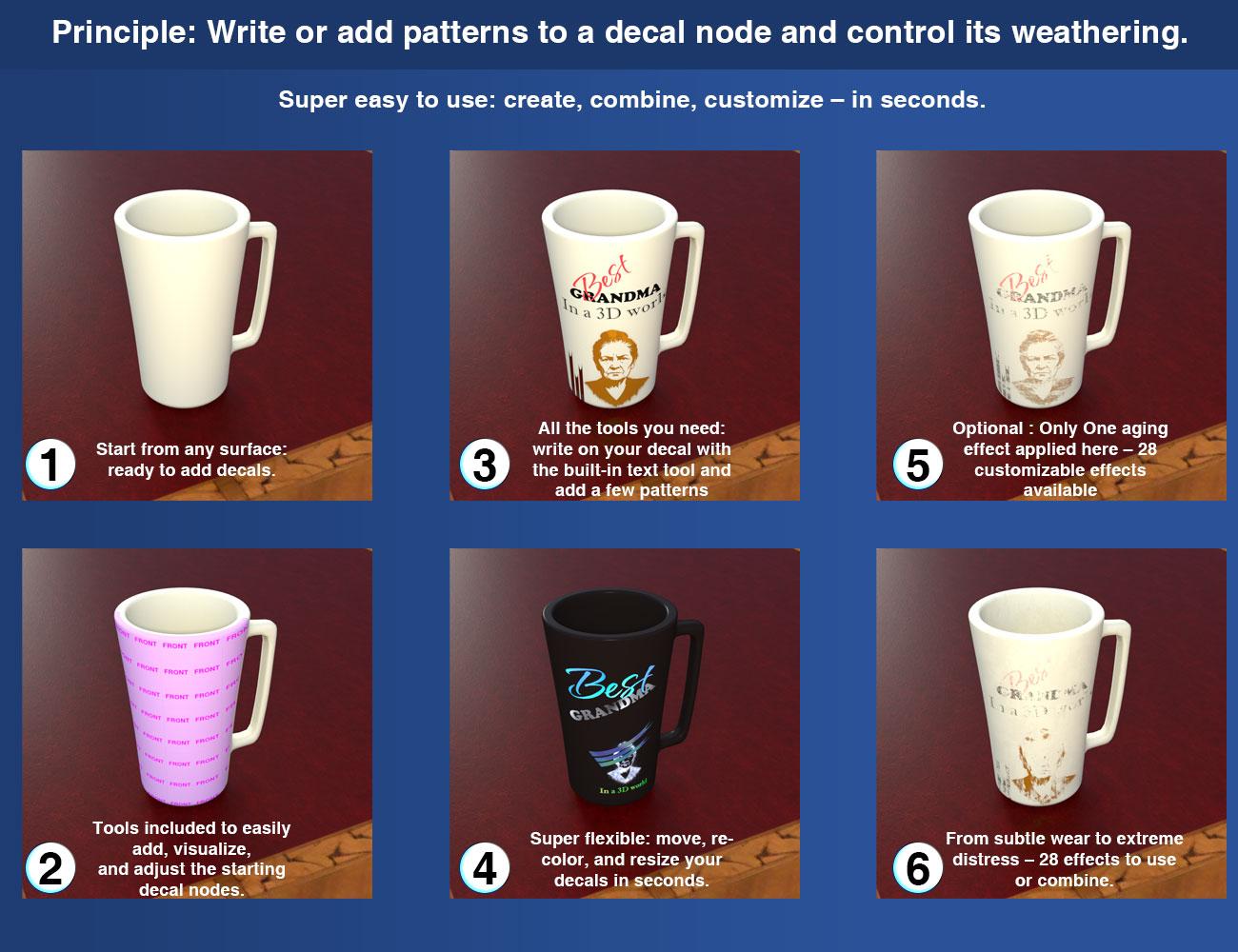 How it works: everything is based on Decal Nodes. Take Care, DECAL NODES ARE IRAY ONLY! (In other render engines, they may be used to generate the written or decayed maps, but they are not visible and cannot project anything).