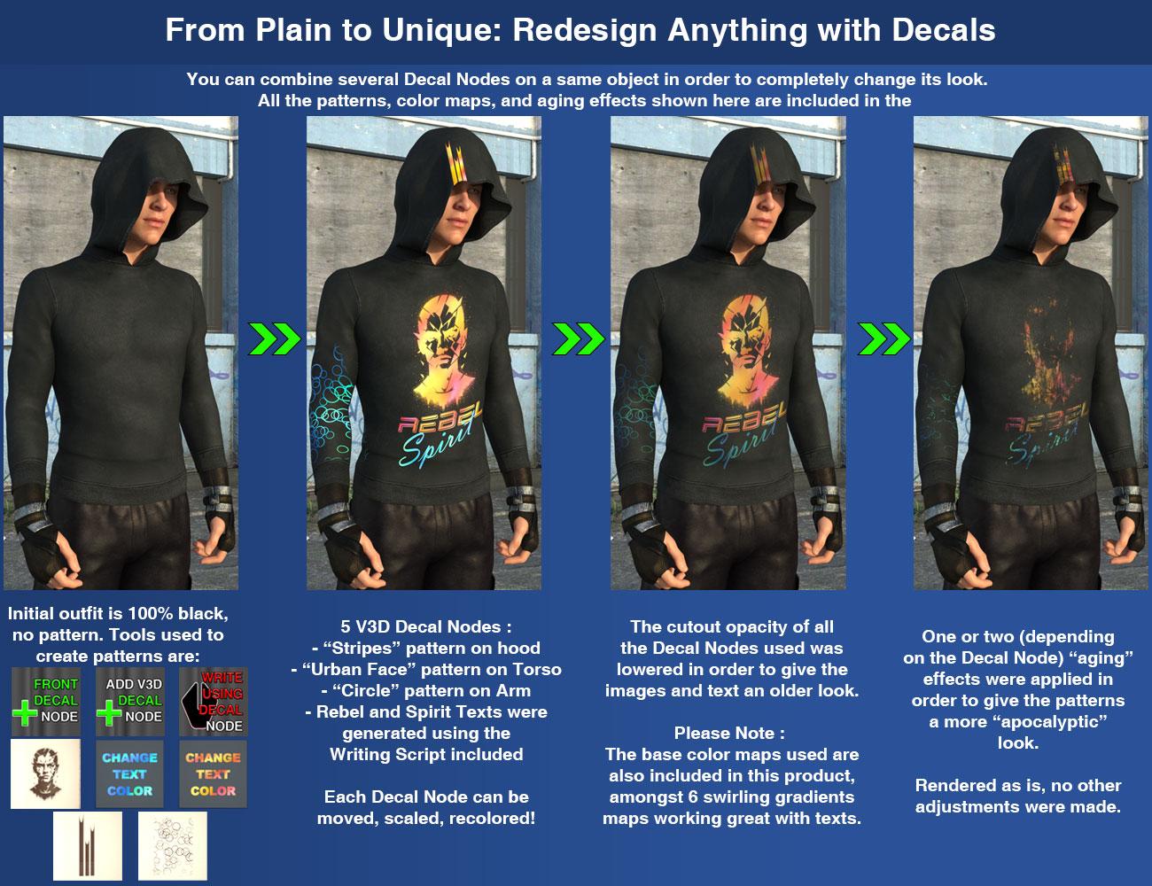A script is included to easily add text to your decal nodes (you transform your decal nodes into decal texts). Choose any font, color, opacity, style, alignment, or line spacing to compose exactly what you want. One word, a sentence, multiple lines – or mix several decals with different fonts and colors.