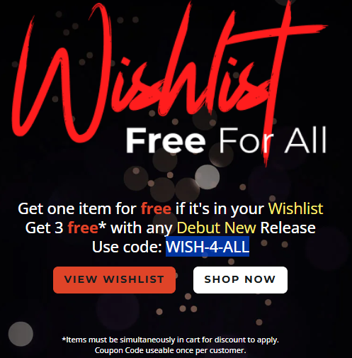 The coupon works for three free items from that selection that are on your wishlist when you also have a Debut new release in your cart, but doesn't for one item.