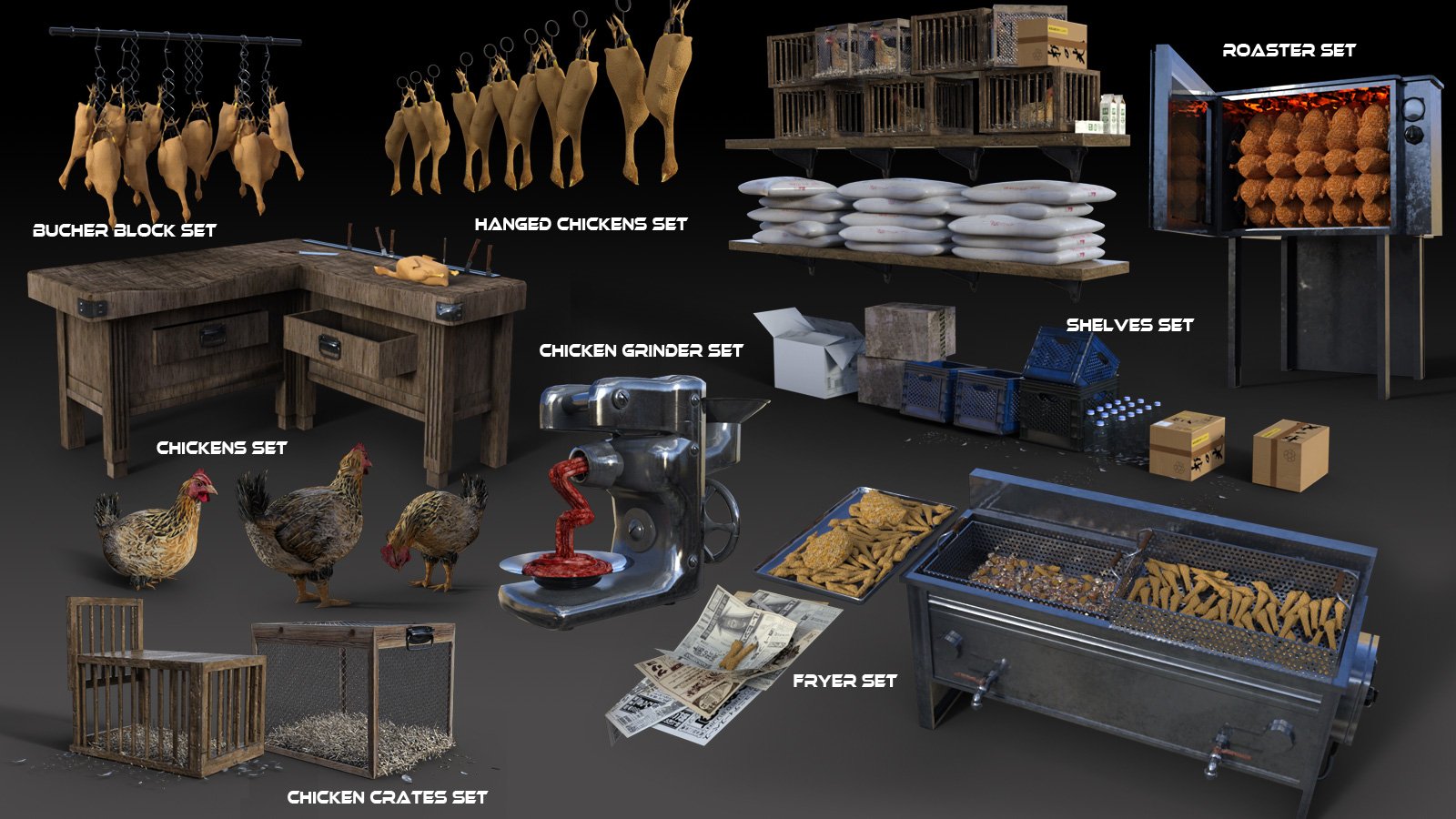 If you don't have to pose them, strangely https://www.daz3d.com/fried-chicken-store has some: