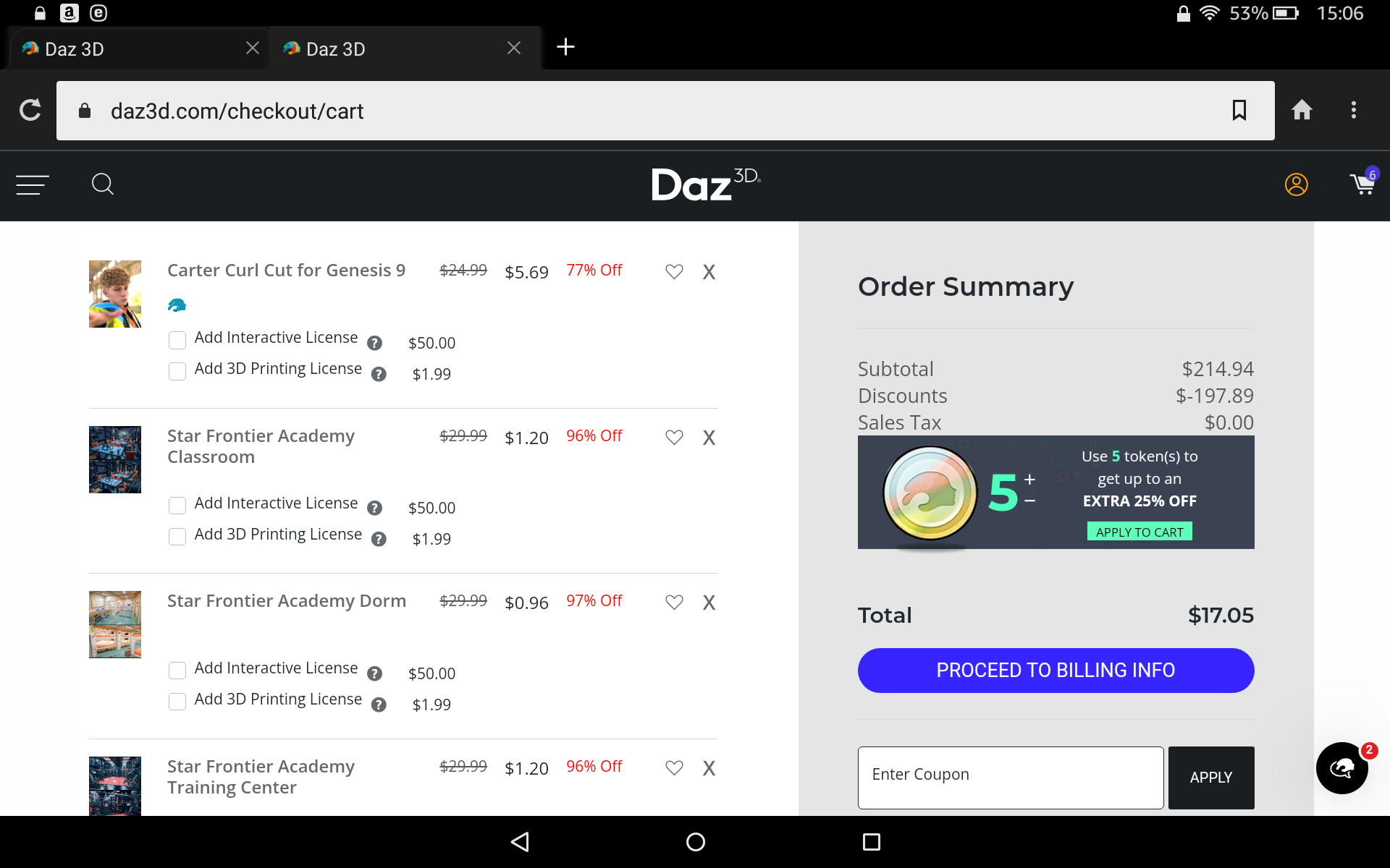I have discovered a sales bug. Carter plus the leg augments with 21 Stackers, Premier discount and 8 tokens is exactly $10. Try to use the $10 Premier coupon, it is then exactly $0 and the system removes all your tokens because it does that now. So the price jumps up again.