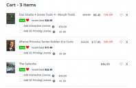 Thank you, Cris, for following through. I didn't see any message saying that you reported it, only the proverbial "it works for me".Daz makes everything a frustrating and disappointing struggle. What a way to run a business! I finally was able to buy my cart. Thanks for your help.