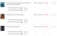 Does the Flash Sale not work with Daz+ New Releases? I have both of yesterday's D+ new releases in the cart (which I did put on WL yesterday) plus an older dress from the flash sale selection that I've had wishlisted for a while. The dress appears to get the correct 75% discount for being in my WL. But it doesn't appear either the dress or the New D+ items are getting the extra 30% off for having those 2 New Releases. The D+ items should drop to the $2.99 floor price if the store was discounting correctly and New D+ products aren't an unmentioned exclusion.