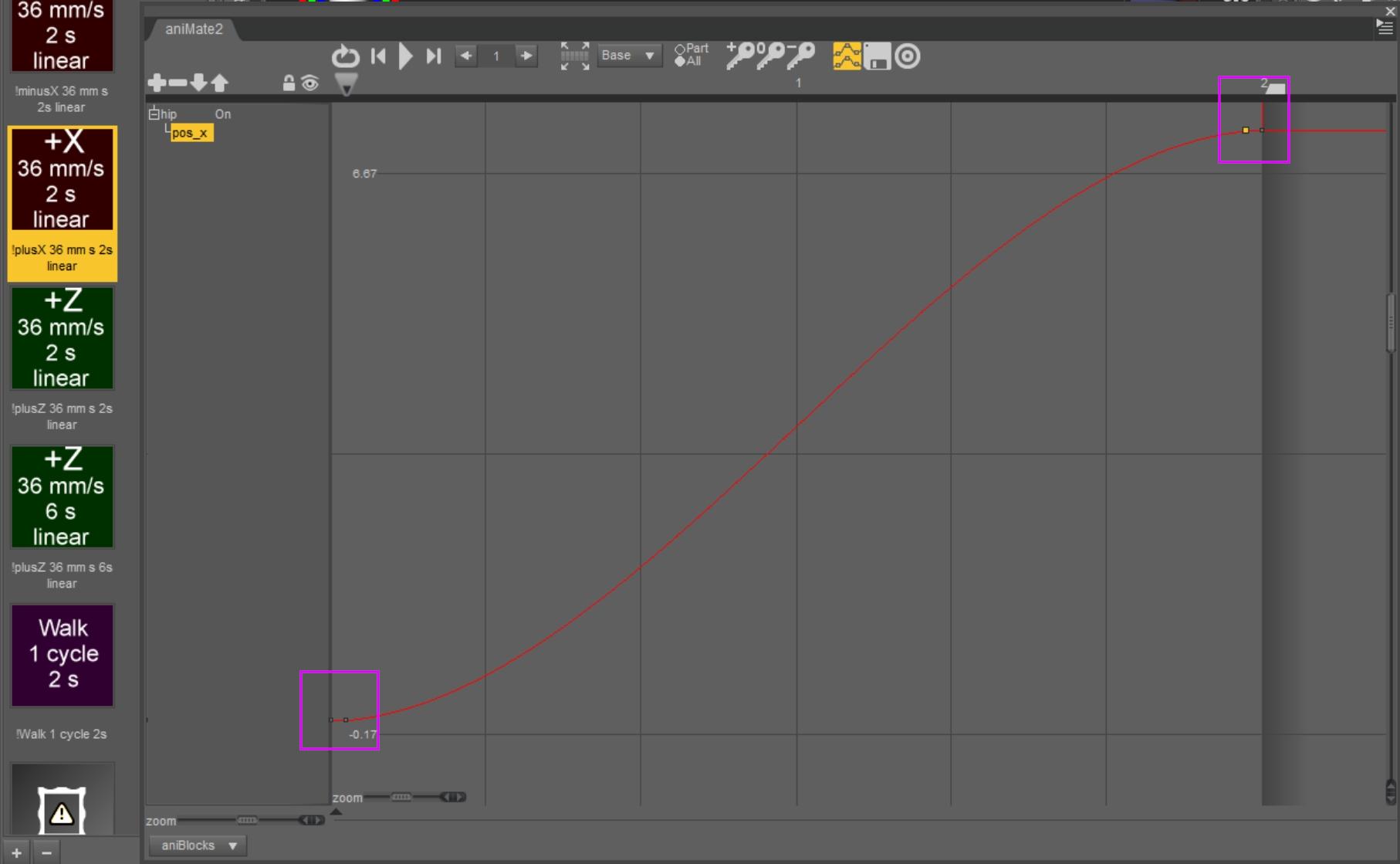 The goal here is to get a 2 seconds +X 36 mm/second LINEAR aniBlock move.