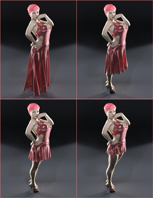 A collection of models of ladies' dress, with a halter neck and wide flared skirt and cutouts at the bust and each side, rigged in DAZ Studio for Genesis 8/8.1 Female, intended for use with dForce dynamic cloth simulation. All of these models share the same UV map and any textures for this item will work on any of them. A large assortment of Iray materials are included, as well as some shaders that allow for various degrees of transparency simulating thread weave. This model has less geometry detail than most of my others, but a higher polygon count; I have shifted over to this style because the geometry detail just makes these dresses harder to work with in more diverse shapes and I also wanted a wider skirt with more folds for a prettier drape. See readme for more info!