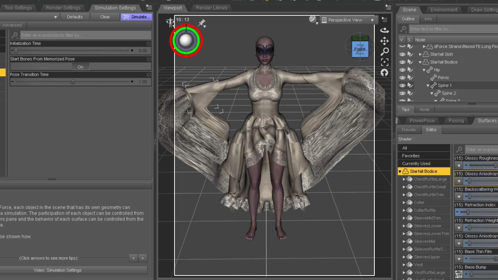 I tried it again using bluejuante's https://www.daz3d.com/akki-hd-with-expression-for-genesis-9. Knowing where I had fabric shredded, I used the morphs that are part of the top and skirt and expanded the areas before the simulation. I also remembered to use dForce Companion 2.0 which I was able to buy before it was pulled out of the store and put behind a paywall. I only adjusted the Collision mesh resolution to 'Best'. The Timeline remained at 61 frames, the pose at 30, and I made sure to click on the Starfall Basic Sim Setting G9 to the outfits two pieces. While the hair is able to be simulated, I closed it off for this test. I also used an invisible plane under the character in case the outfit dragged on the floor.