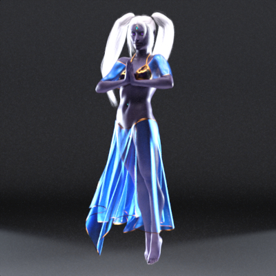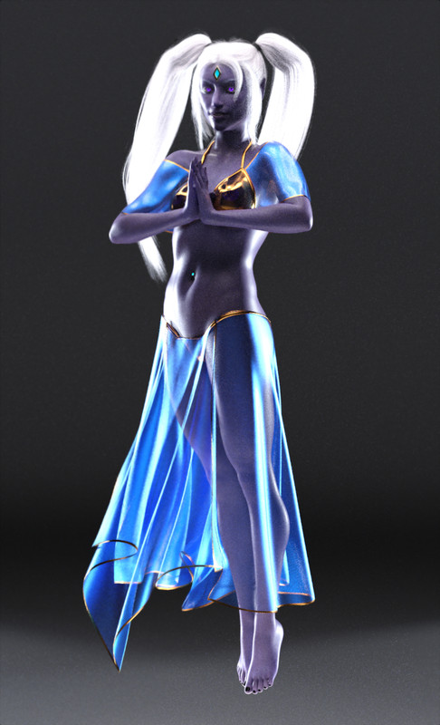 A collection of models that combine into a gossamer-skirted outfit suitable for a si'la, a form of djinn from Arabic mythology, rigged in DAZ Studio for Genesis 8/8.1 Female, intended for use with dForce dynamic cloth simulation. The outfit consists of a bikini top and bottom, rigged separately as regular conformers; and attachments for the skirts and stole (a loose fitting garment worn around the shoulders) that are to be simulated as dForce dynamic cloth. Wearable presets are included to load the upper and lower parts of the outfit seprately or to simply load it all in one click. See readme for more info!