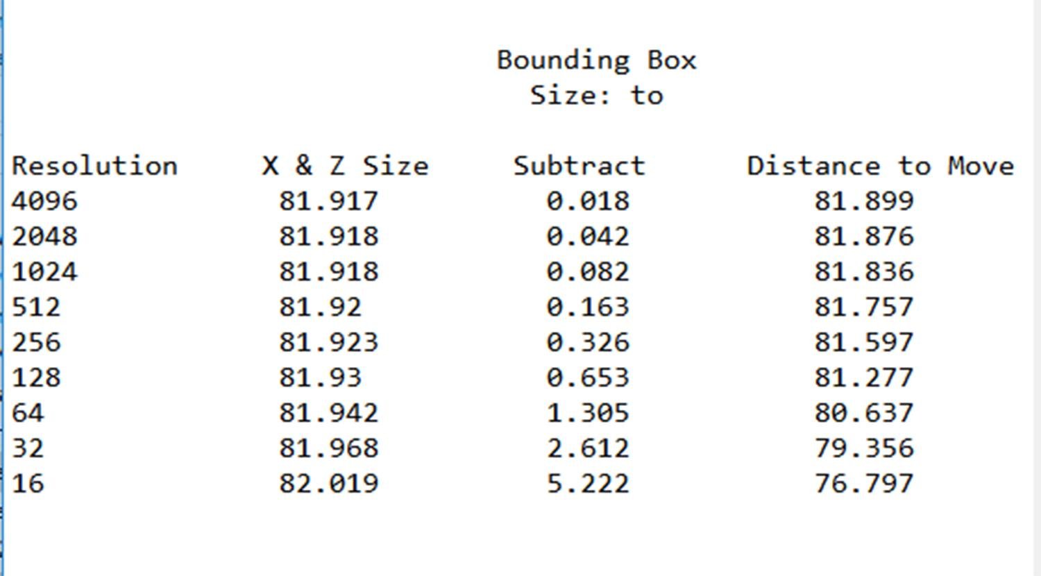 Every terrain resolution (in the terrain editor) will generate a different-sized terrain. The size shown in the terrain's attributes menu is the size of the Bounding Box, not the size of the actual mesh that makes up the terrain's geometry. This is a cheatsheet that shows how many Bryce units to move for the different terrain resolutions.