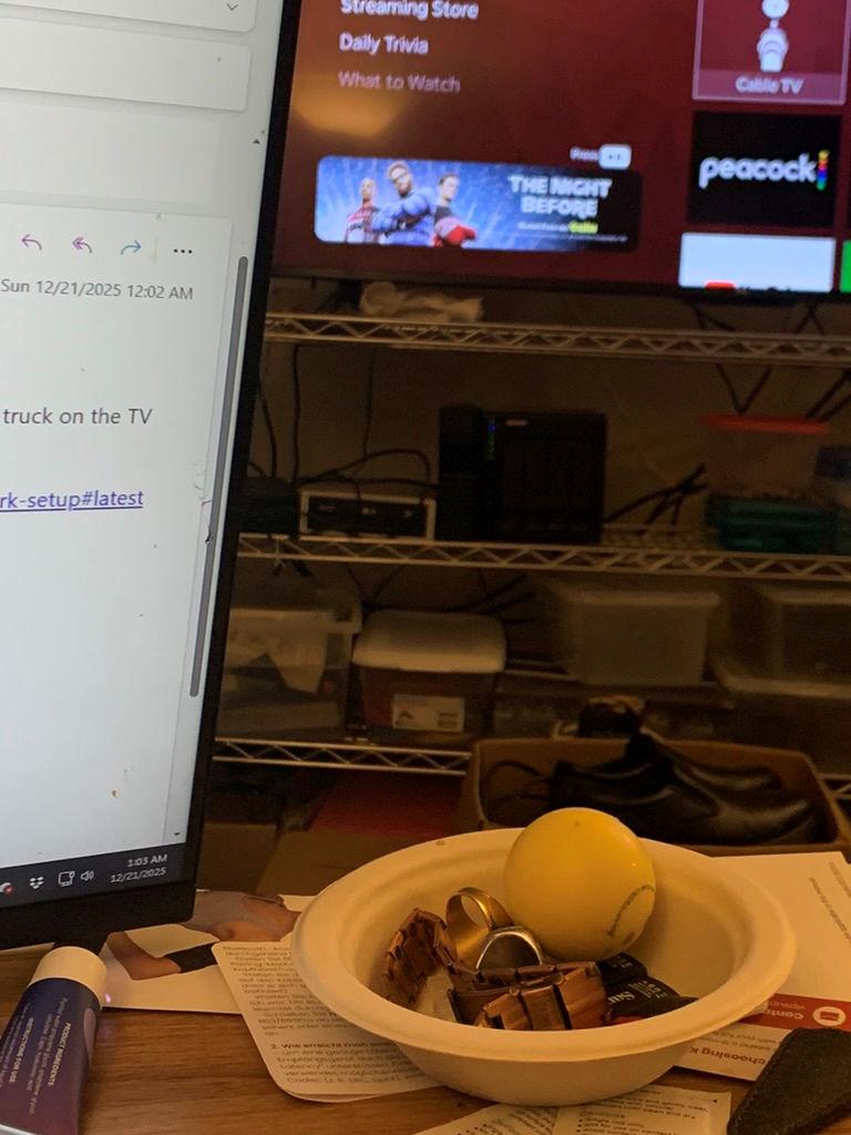 Across the room is a 55" 4K TV that is connected to a mini PC and a QNAP box containing 4 hard drives and 40TB (I'm too lazy to try calculating it right now.)
