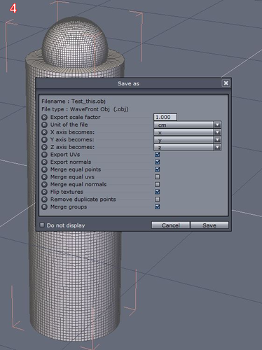 Step three: Send To Hexagon, once Object is selected the Axis SHOWS centered for the Object, That is miss leading. Look at it and you will see the bottom of the object is still at the Wolrd Base. I move the object down so the axis lines up with the World base Axis lines. That's Image #2. I now save this as the Object File with Scale set to 1 and Unit of file set to cm. That's Image #4.