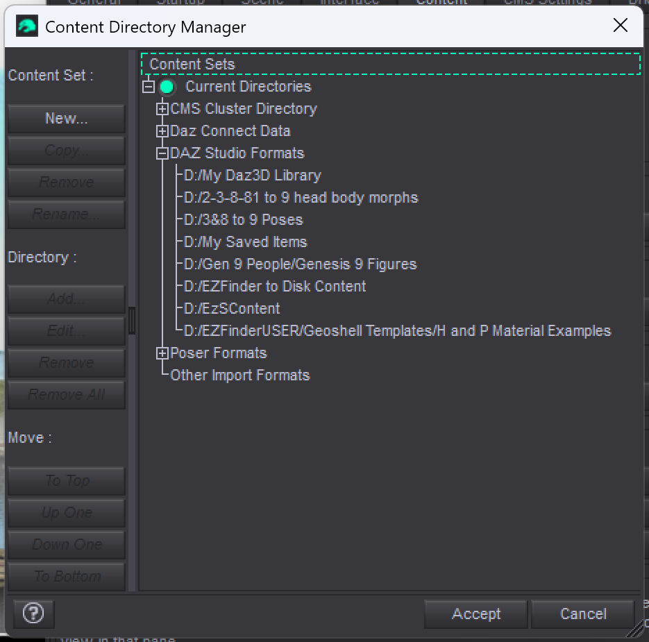 I've looked and there are two, the content directory I've been using for 12+ years where all my content is downloaded to (Q:/dazstudio3), and then q:/daz which holds my saved scenes (going back to 2012) and scene subsets, presets, etc. Like I said, never had any trouble before. Everything saves ok except render settings and it's only the 'environment' tab that reverts to default, filtering, optimization and the rest are all saved and reopened o.k.