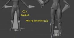It looks like the rig conversion changes the rest pose and the geoshell doesn't follow. Perhaps the rig conversion expects a single geometry, especially if it is for a game engine, if this is the case you can try to join the geometries before conversion.