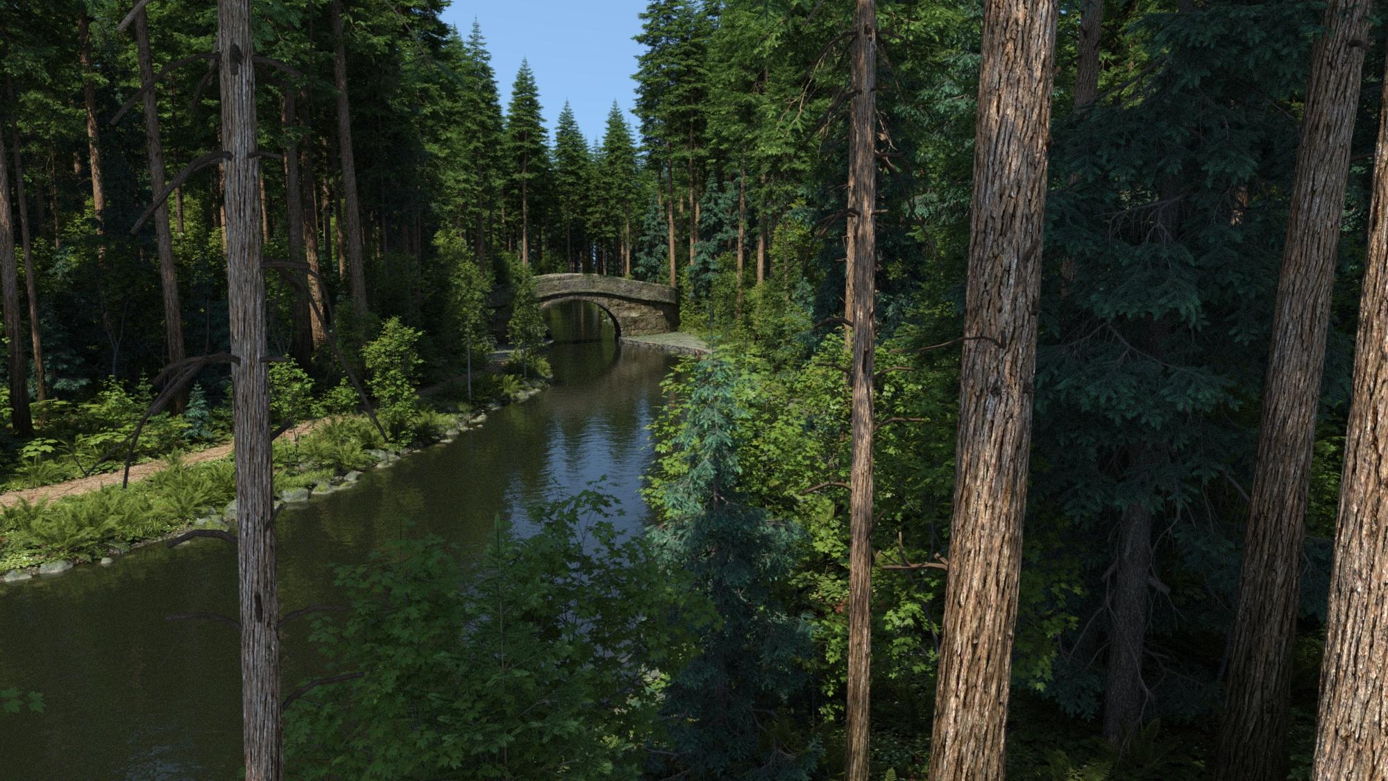 Here is a quick UltraScenery2 render with Pacific Northwest (classic content) using one of the Snake Bridge terrains (UltraScenery 2 product). I only rendered this to 7% complete, and it already looks pretty good. You don't have to let UltraScenery scenes render all the way to get a usable result.
