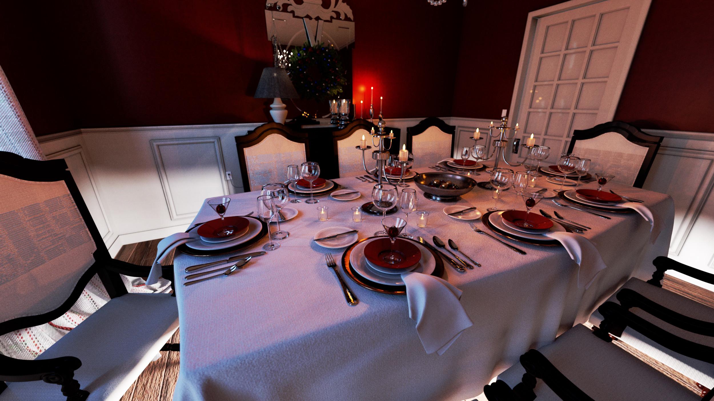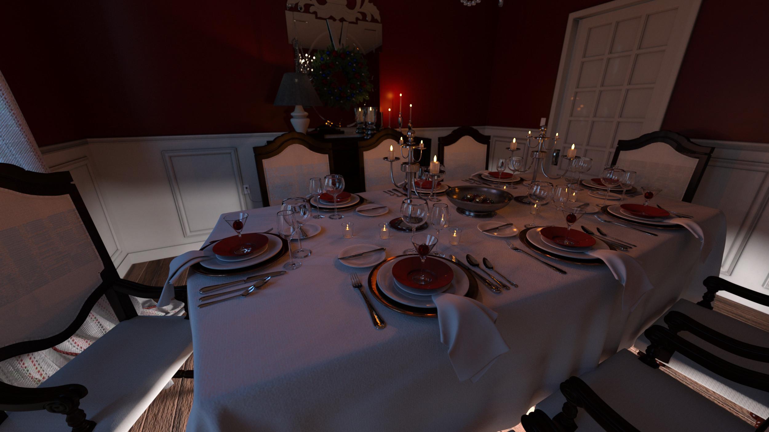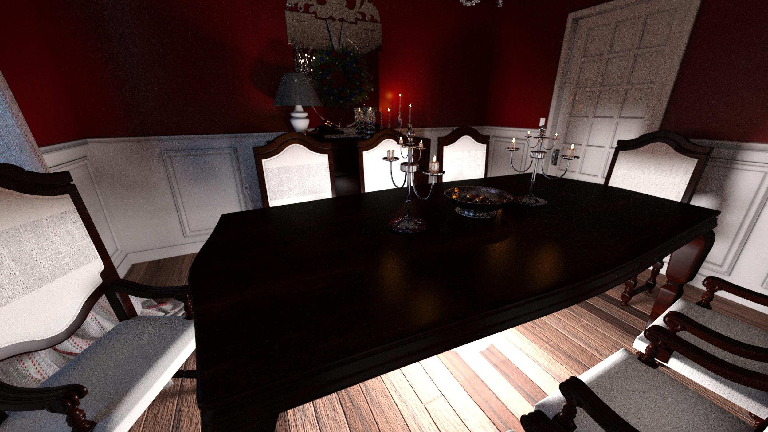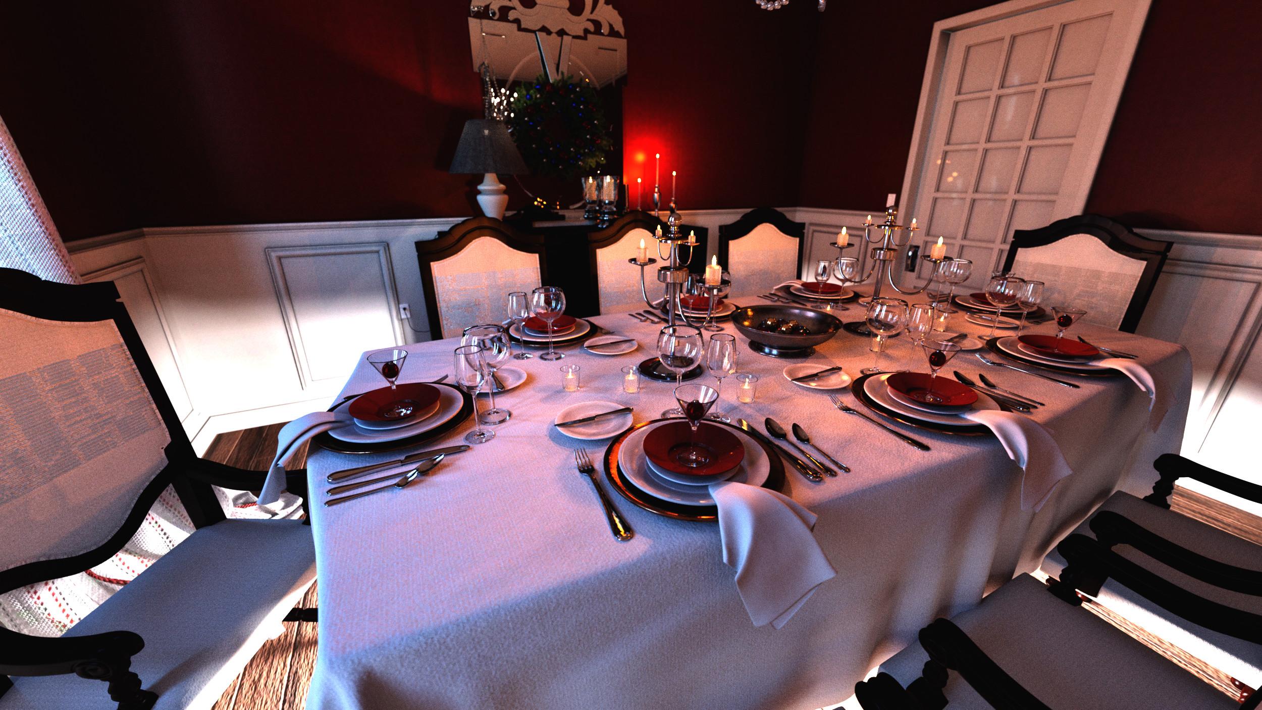 Thanks. @TabascoJack!  That about sums up Christmases past at my house.  :)  I couldn't resist taking off the white tablecloth and seeing how the table rendered.  It's a beautifully done table under that white tablecloth.  I'll have a render of the table finished soon without all of the table settings.