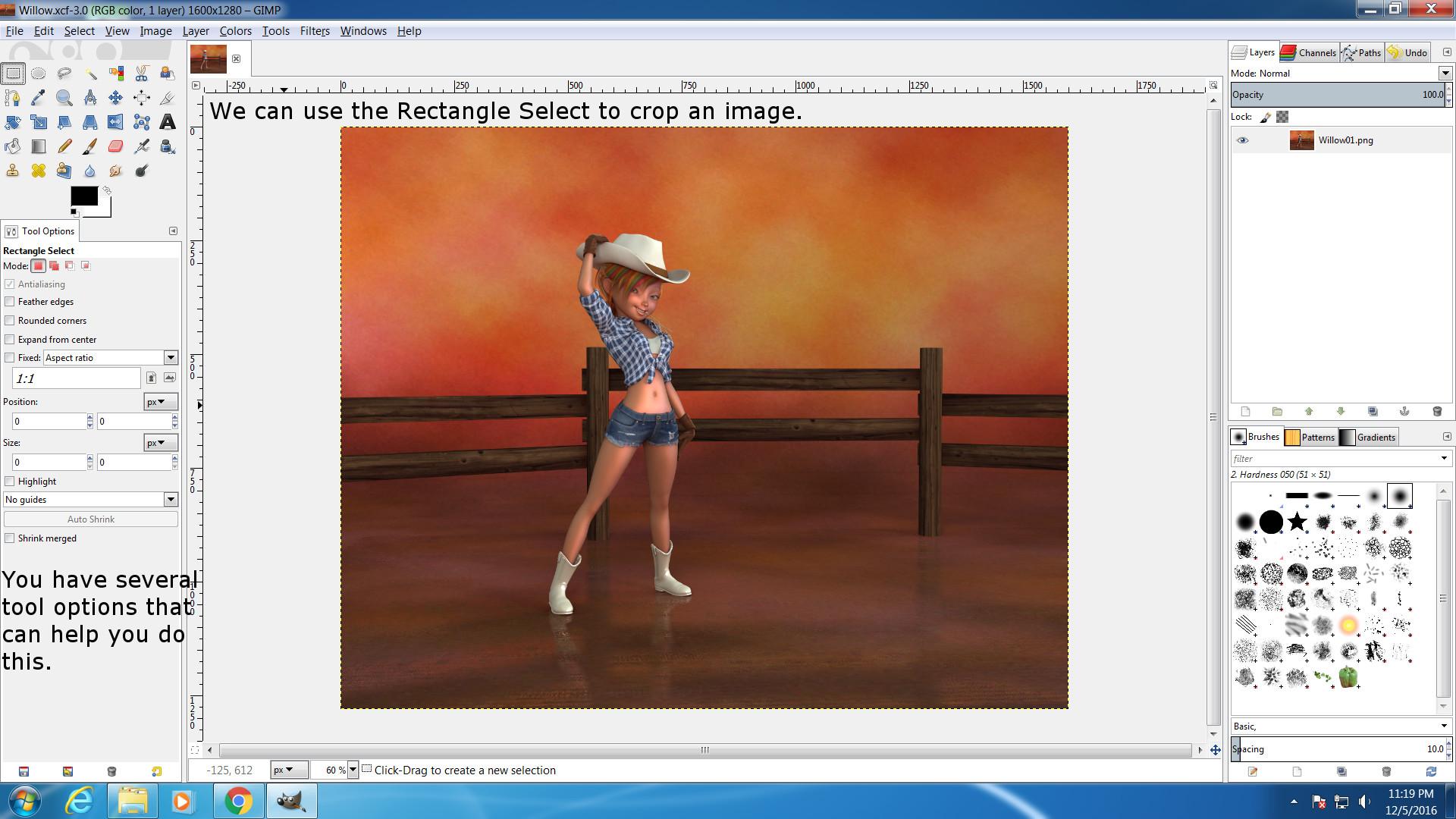 Homework:  Open an image in Gimp and work with the Rectangle Select.  Crop and image.  If you post an image to the thread, please upload a before and after cropping so I can see how you did.