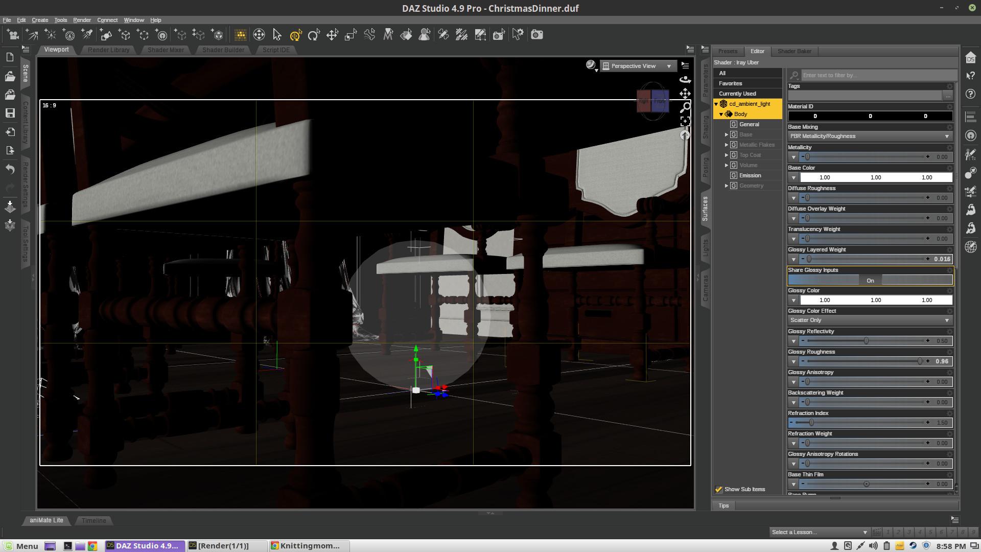 You would not believe the trouble I've had with my latest render!  When I saw the Christmas Dinner set by @Bluebird3D, I thought it would be perfect for a Christmas Card.  Yes, I know, I'm running late getting those kinds of things out, which is why I usually end up not doing them.  I thought I'd be different this year and actually send out some cards.  I started this in Windows after I finished the last Gimp tutorial since I was in there anyway.  Big mistake.  First I couldn't get it to render like the promos.  None of my settings came away looking anywhere near as pretty.  Turns out, Smart Content was hiding a few things which is why I usually never use it.  I don't know why I was this time.  Probably because I miss having any kind of CMS in Linux since I still haven't gotten that working yet.