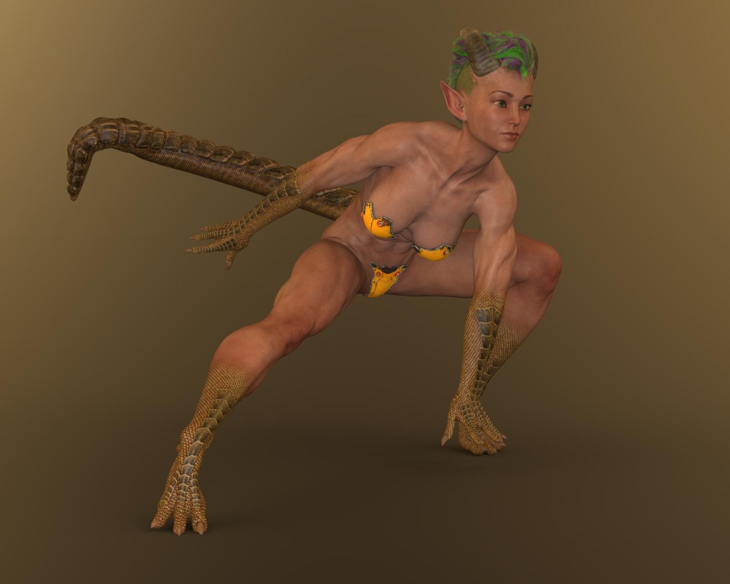 I'm working on a piece with @RawArt's Dragelle.  I've come to the conclusion that I don't own the appropriate clothing for her.  I'm going to definitely have to possibly make something custom for her or try to modify an outfit in Blender or Hexagon that I'd love to see on her.  I'm thinking that Badlands Maiden would be just about perfect but the skirt isn't cooperating.  It's little high up on the waist in the back for her tail.  Dystopian Princess is another option that I already own but, again, the skirt is too high in the back and interferes with the tail.