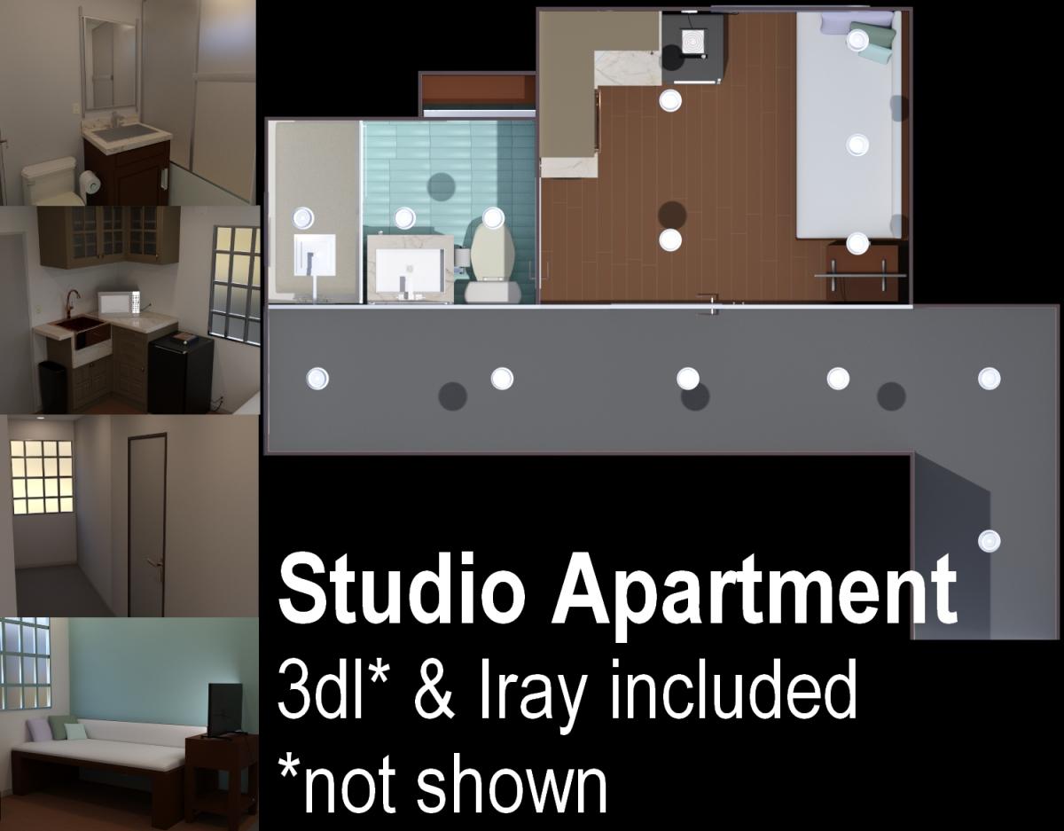 This is a Studio Apartment. All the walls, floor, doors, and door handles are seperate props. As are the Kitchen cabinets, Bathroom Vanity, toilet, Tub, Bed/couch Pillows, Microwave, Fridge, Hotplate, End table and TV; everything is modeled in Blender. Everything is scaled properly for Daz figures.