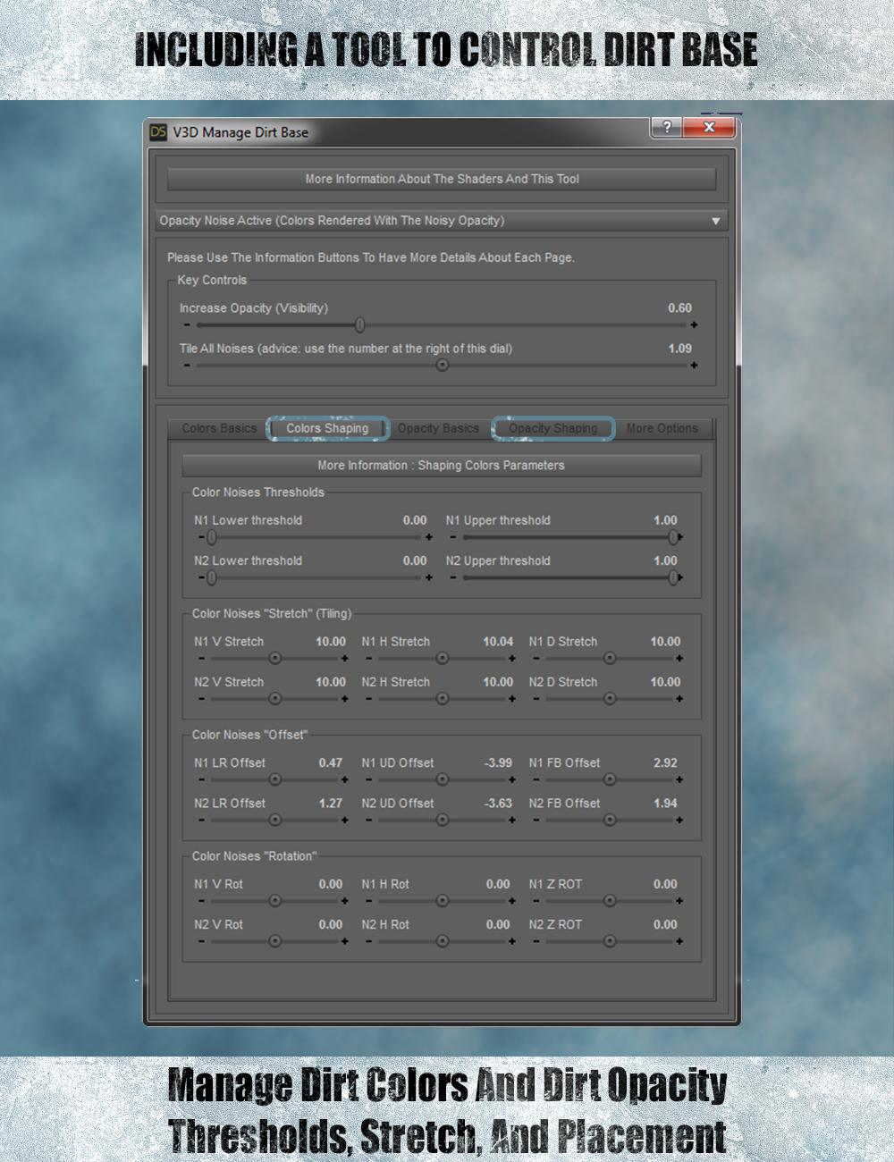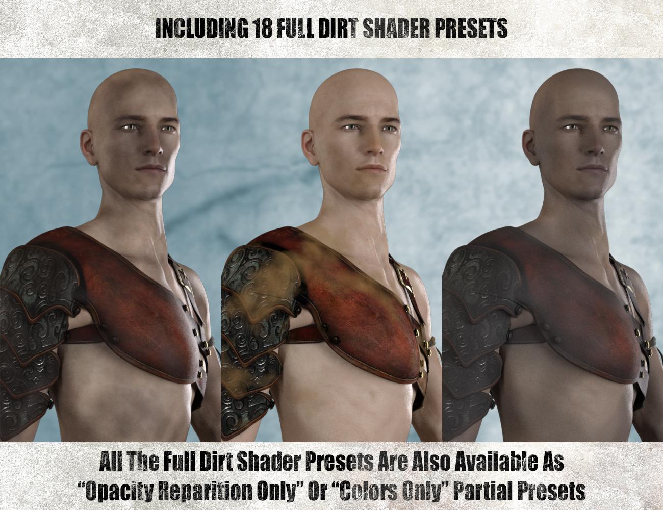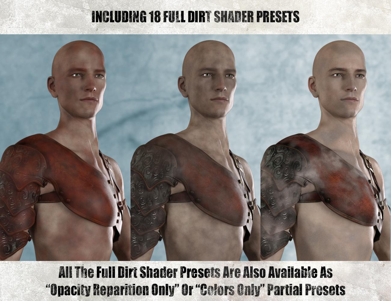 - The product also includes full dirt shaders presets, partial dirt colors only shaders presets, and partial dirt opacity repartition only shaders presets so that you can mix easily dirt repartition and dirt colors.