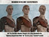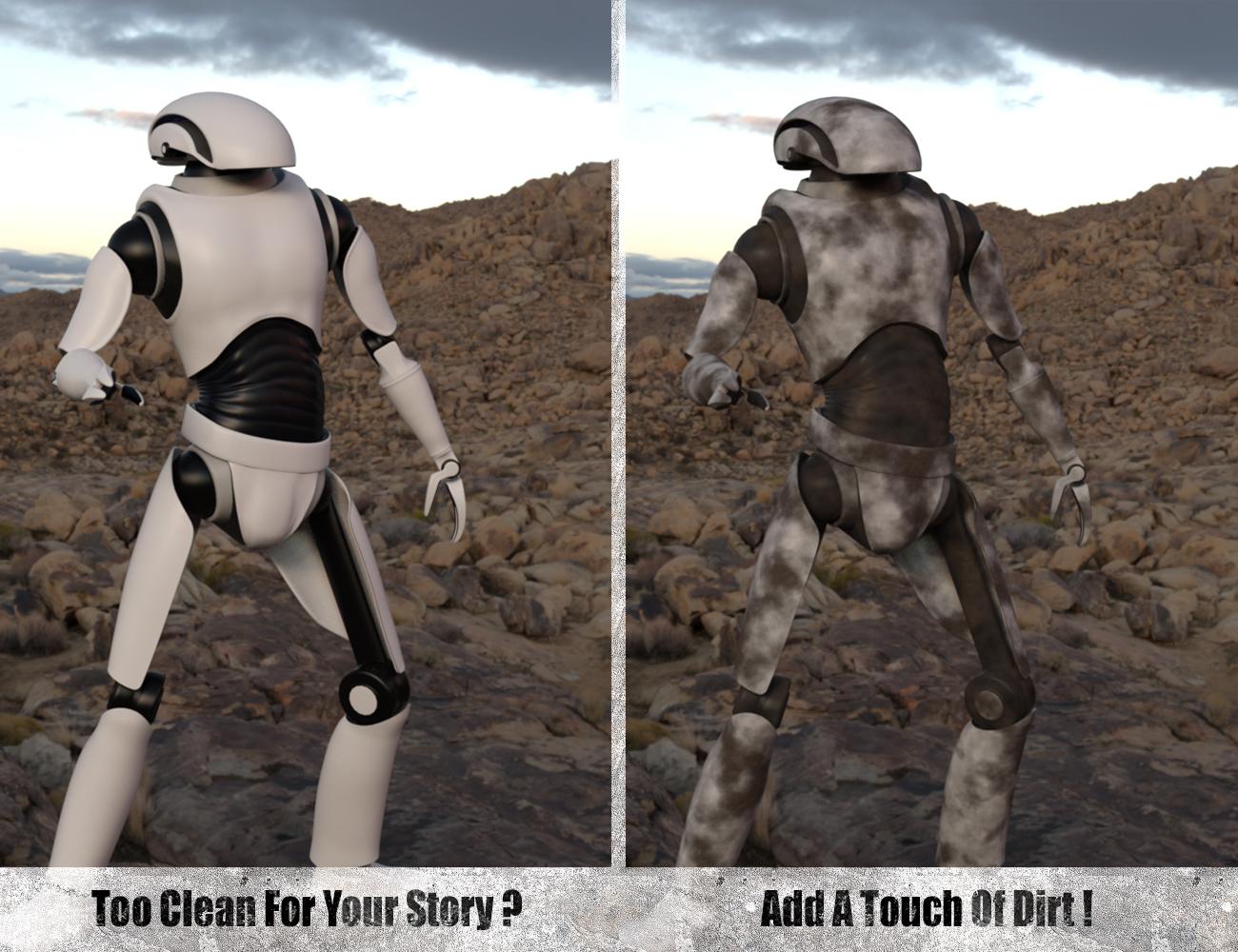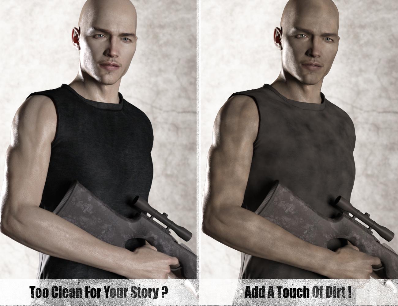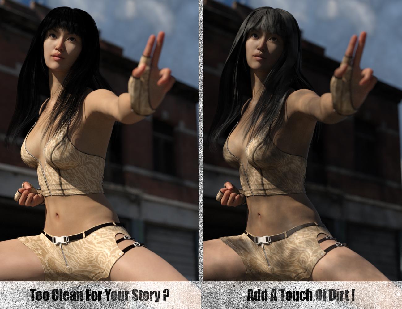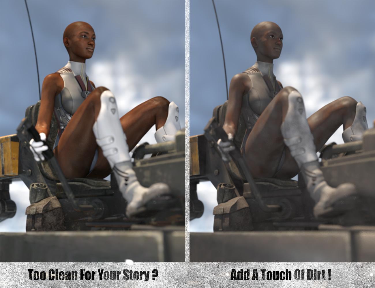 A touch of dirt for Iray will add dirt to any figure or object in your scene. I had this idea because I saw so many clean figures, in their clean outfits, holding and surrounded by clean props, but rendered in dirty environments, or rendered in circumstances they should not be "that clean".