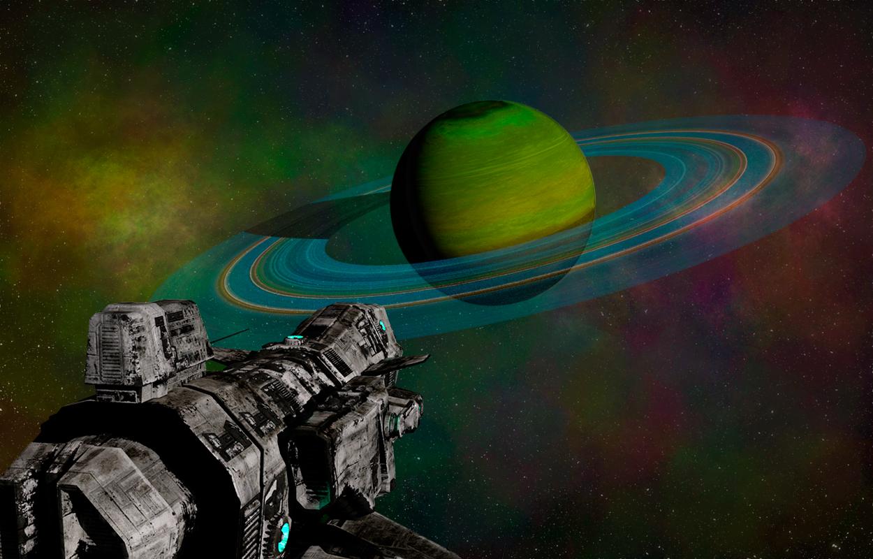 Messing around with texturing. The planet is multiple sphere primitivies with a base and cloud textures of varying opacity and bump. The rings are also a primitive with textures and and opacity maps created in photoshop. The background is pure photoshop and the ship is Marcoor and rendered with canvases.
